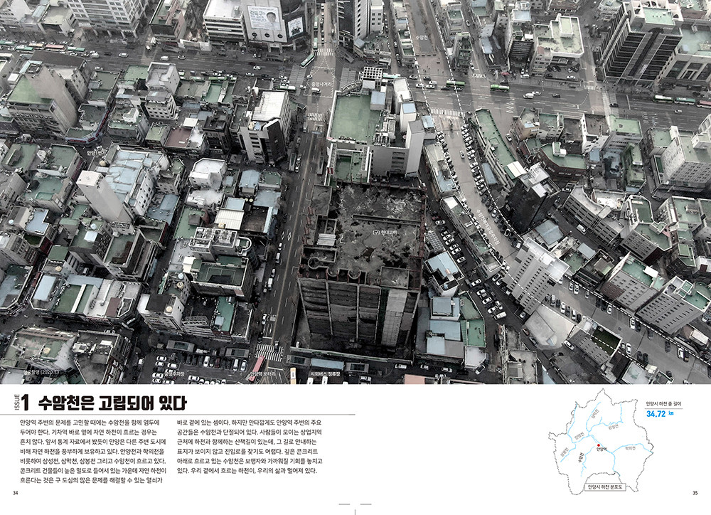 도시공상 첫 번째 장소로 구도심의 중심인 안양역 주변과 수암천 일대를 이야기하고자 한다. 90년대까지는 안양시에서 가장 번화한 지역이었지만 현재는 쇠퇴되어 그 색이 바랬다. 안양시의 역사만큼 오랜 이야기를 지니고 있는 이곳과 인접한 수암천을 같이 살펴보며 구 도심의 가능성을 생각한다.