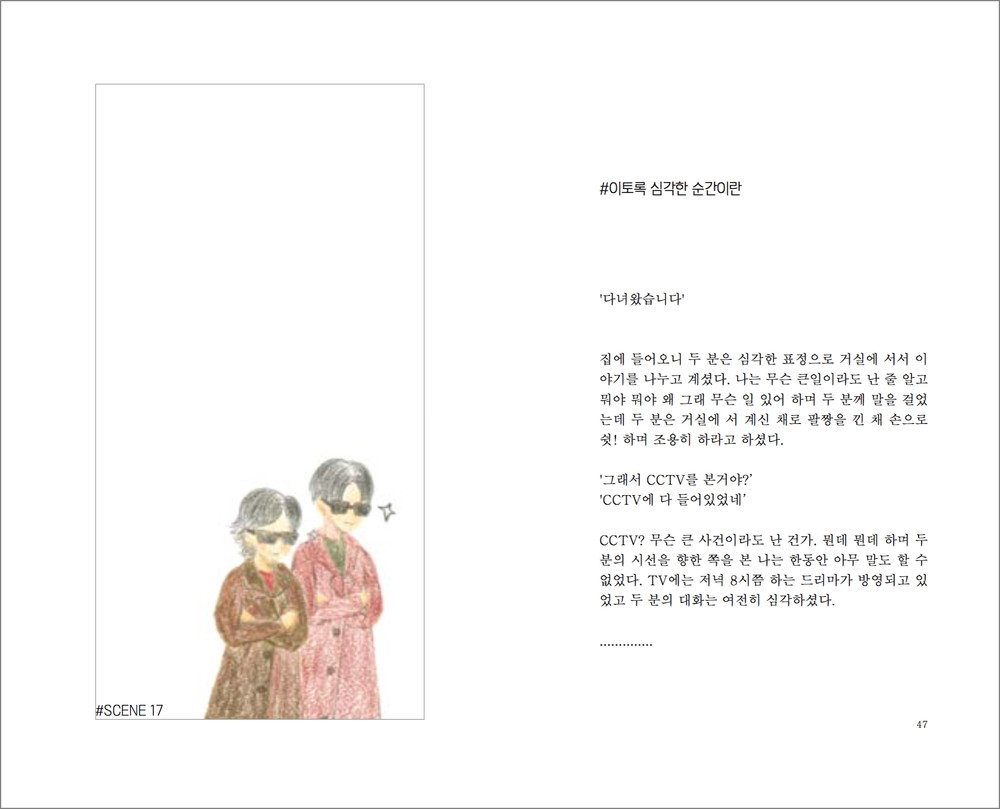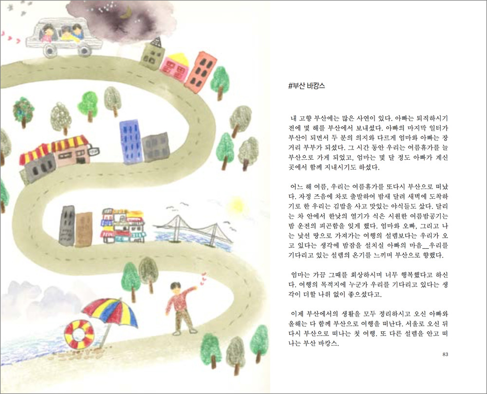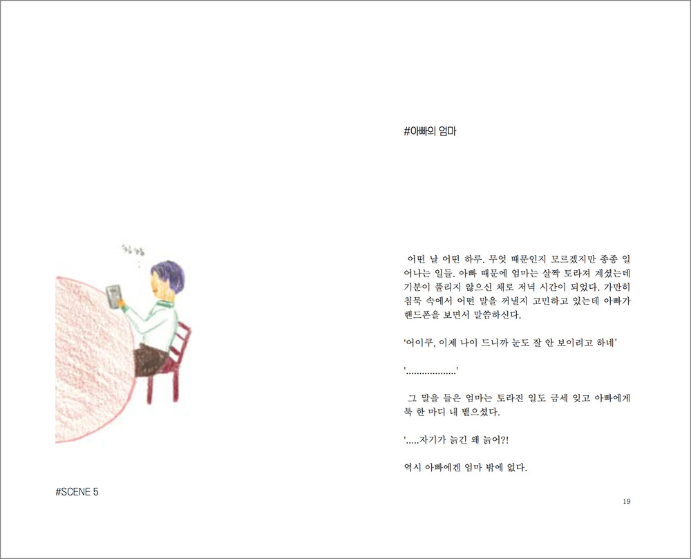난 가끔 부모님의 부재에 대한 상상을 하곤 한다. 그런 순간은 누구에게나 피해 갈 수 없는 시간이기에, 그 순간의 나는 또 어떤 모습일지 상상해 본다. 말로 다 할 수 없는 이야기들을 두 분의 대화 그대로 여기에 옮겨 적었다. 두 분의 평범한 대화는 아마도, 아주 먼 훗날에 비교할 수 없는 그리움으로 다가오겠지.