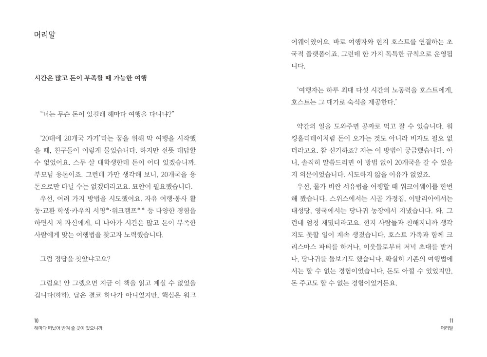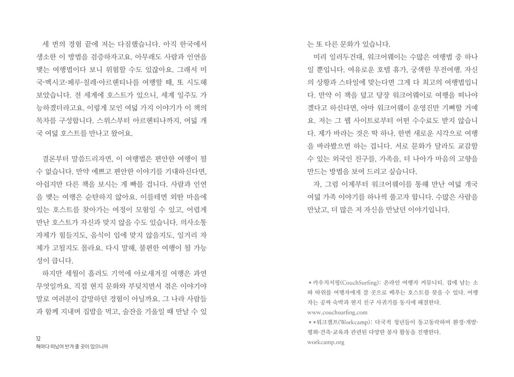 미리 일러두건대, 워크어웨이는 수많은 여행법 중 하나일 뿐입니다. 여유로운 호텔 휴가, 궁색한 무전여행. 자신의 상황과 스타일에 맞는다면 그게 다 최고의 여행법입니다. 만약 이 책을 덮고 당장 워크어웨이로 여행을 떠나야겠다고 하신다면, 아마 워크어웨이 운영진만 기뻐할 거예요. 저는 그 웹 사이트로부터 어떤 수수료도 받지 않습니다. 제가 바라는 것은 딱 하나. 한번 새로운 시각으로 여행을 바라봤으면 하는 겁니다. 서로 문화가 달라도 교감할 수 있는 외국인 친구를, 가족을, 더 나아가 마음의 고향을 만드는 방법을 보여 드리고 싶습니다.