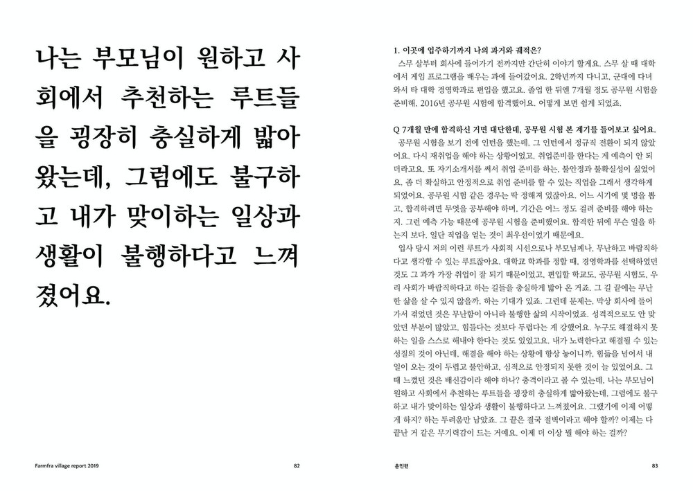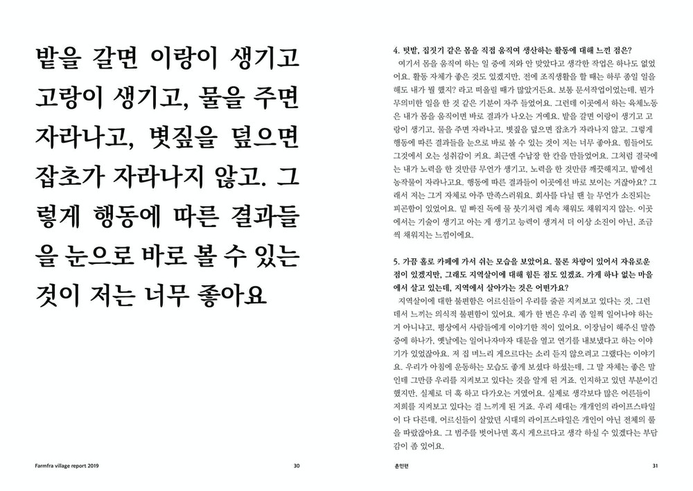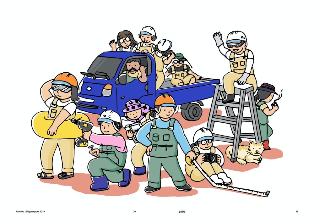 촌민편은 팜프라촌에 입주한 촌민 8명의 솔직한 이야기와 그들의 모습을 담은 일러스트로 구성되어있습니다. 입주기간 중 총 2회 인터뷰를 진행하여, 입주 초반 촌민들의 생각과 입주 후반 촌민들의 생각의 변화나 경험을 나눌수 있도록 담았습니다.