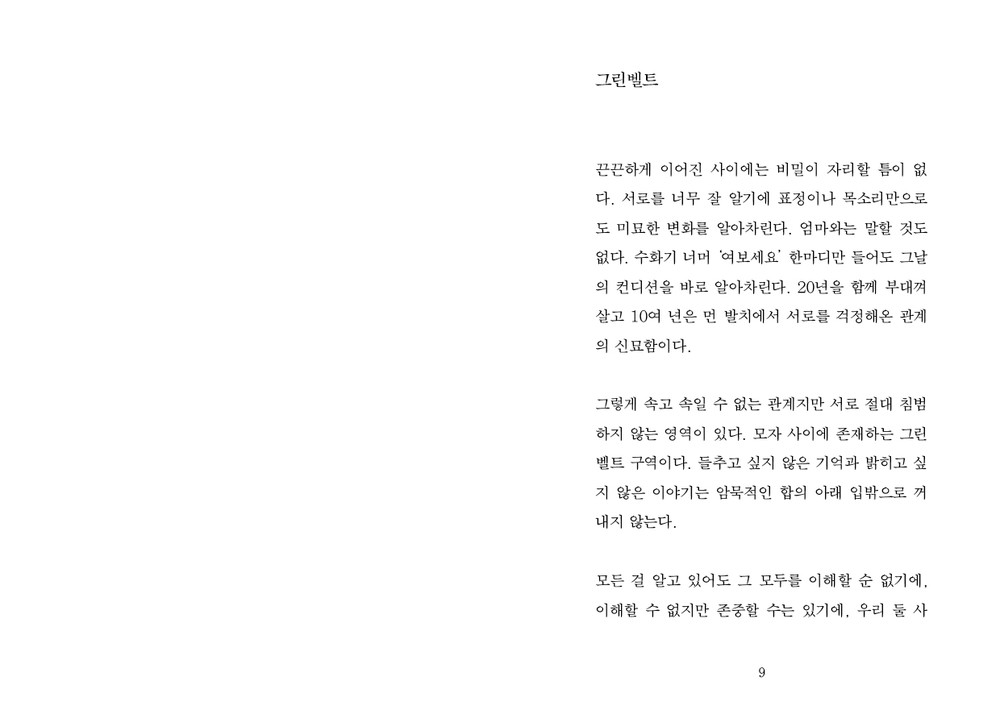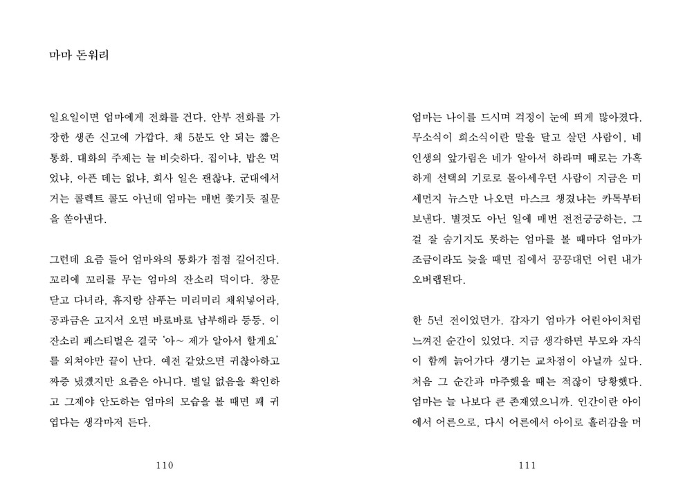 “괜찮아.”엄마에게 가장 많이 하는 말이다. 연락이 없으면 걱정하고 연락을 하면 혹시 무슨 일 생겼나 걱정하는 이 사람에게 가장 확실한 안정제이자 마법의 문장이다. 물론 괜찮지 않은 날이 더 많다. 하지만 결코 말하지 않는다. 숨긴다기보단 엄마라는 소중한 존재에 대한 배려에 가깝다. 내게는 잠깐의 토로일 뿐이지만 이 사람에게는 그 즉시 잠 못 드는 이유로 자리할 것을 알고 있다.