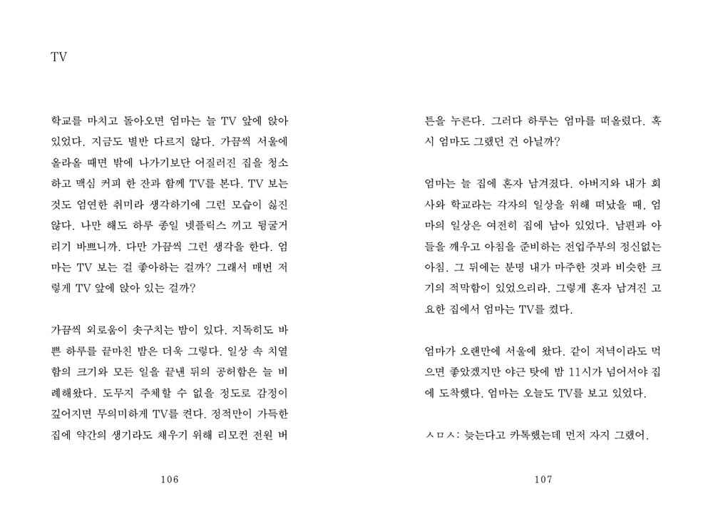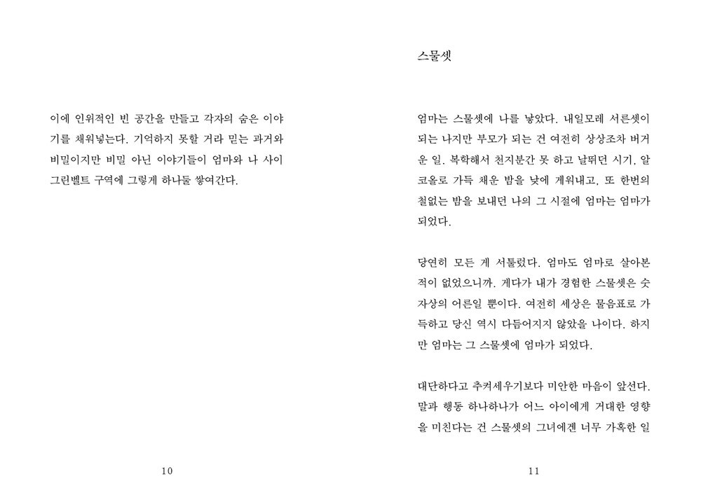 : 나이가 들면서 엄마와 제가 지독하게 닮았음을 알게 됐어요. 어릴 때는 도저히 이해 못 할 존재였는데 지금은 서로를 너무 잘 알고 있달까요. 오히려 그래서 더 미안해요. 이 사람이 저를 위해 얼마나 많은 걸 포기하고 살아왔는지 피부로 느끼거든요. 글에서 엄마에 대한 따뜻한 시선을 느끼셨다면 아마 그건 동질감과 연민과 부채감이 뒤섞인 감정 때문일 거예요.