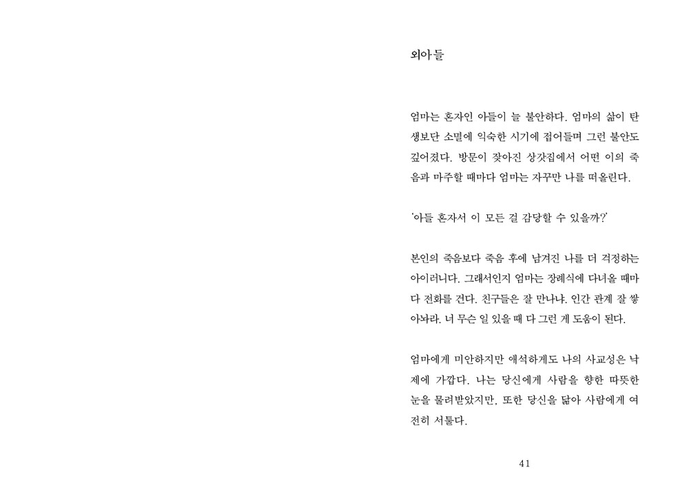 : 엄마는 이 책에 대해 모르고 계세요. 아들로서 떳떳하다 생각될 때 보여드리고 싶은데, 요즘은 그 시간이 안 올 것 같다는 생각도 드네요. 실제로 자녀를 둔 어머님들이 제 책을 보시고 같은 질문을 많이 해주세요. 엄마가 너무 좋아할 것 같다 하시는 분들이 반, 이거 보면 엄마 마음 무너지니 절대 보여주지 말란 반응이 반이라 저도 고민 중입니다.