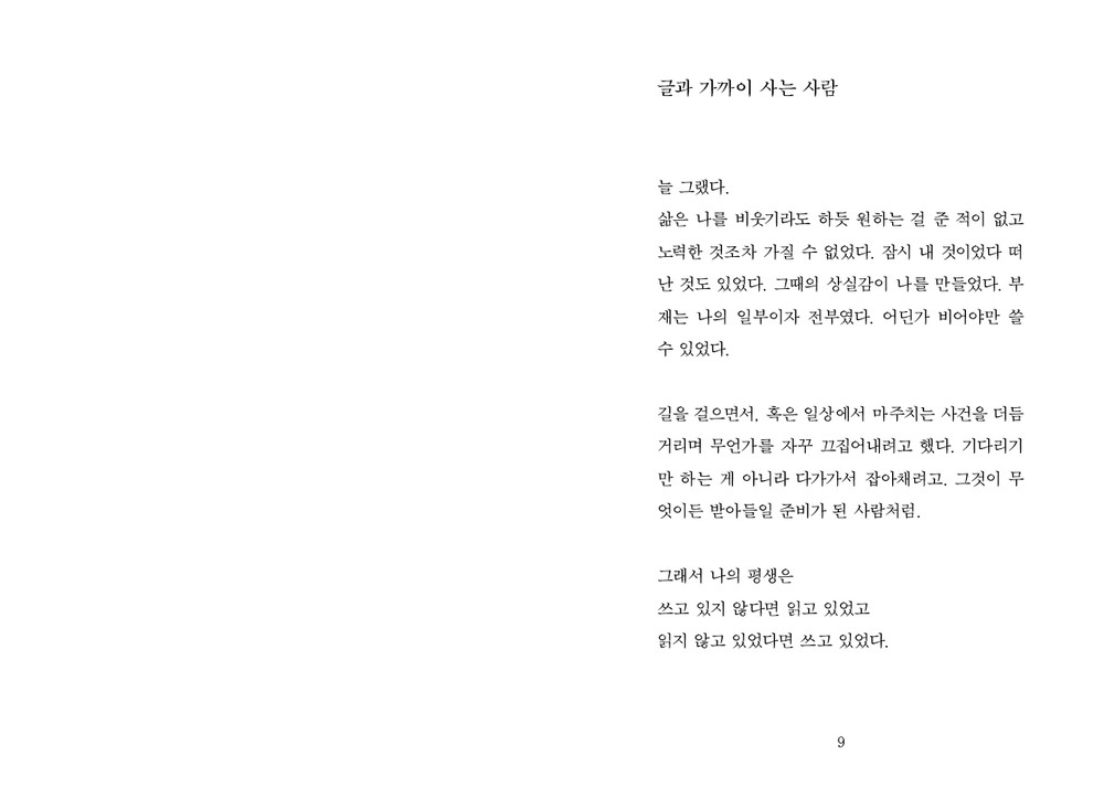 그동안 작가를 꿈꿨던 사람 혹은 작가를 꿈꾸는 사람을 참 많이 만났다. 이런 꿈을 가진 모든 사람에게 적용되는 말은 아니겠지만, 나에게 글쓰기란 제살을 깎아먹는 일이다. 그래서 나는 글을 쓰고 사람들에게 보여주는 것이 항상 두려웠다. 직접적인 경험이든 간접적인 경험이든 글은 나를 구성하는 요소에서 튀어나온 것이다. 어느 순간부터는 거짓말에 서툰 성격이 글에 반영되었고, 어느 시기를 살아가면서 해온 고민이나 관심사가 자연스레 묻어나온 것처럼. 이 글을 쓰면서도 나라는 사람이 적나라하게 까발려지는 게 아닐까 하는 두려움을 지울 수 없었다. 나를 모르는 사람도 글을 읽다 보면 어떤 사람인지 파악할 수 있을 것 같다는 생각에.