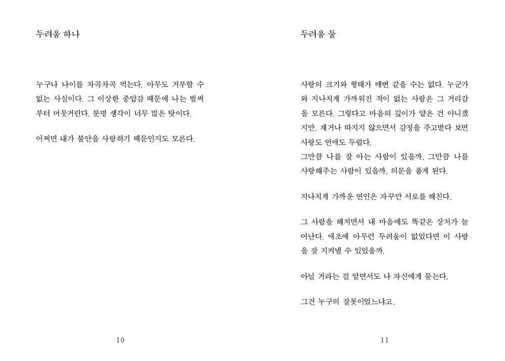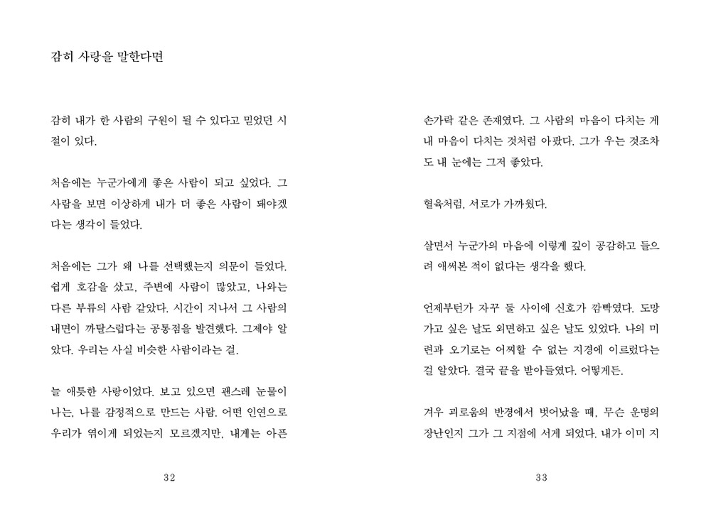 나는 근원적으로 불안을 사랑하는 사람이야. 그건 누구도 바꿀 수 없는 기질이고. 난 매일 그 사람의 얼굴을 보고, 같이 붙어 있는 시간이 길어도 하나도 지루하지 않았어. 그 사람은 때론 자기 혼자 있는 시간이 필요한 것처럼 보였거든. 근데 그 사람도 결국 불안해서 그런 시간이 필요했던 거야, 어떤 면에서든. 우리, 조만간 다시 만나서 사랑의 이야기를 나누자.