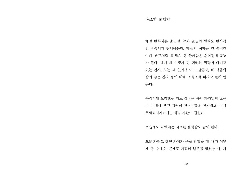 : 대학교 때부터 "불행해야 글이 써져. 연애도 안 돼야 글이 써지지."와 같은 말을 달고 살았습니다. 여기서 말하는 불행은 인생을 망치는 정도의 불행이 아니고 글을 쓰게 만드는 원동력이 되는 정도를 뜻합니다. 단순히 개인적으로 느끼는 '나는 불행해'라는 정도의 느낌이랄까요. 물론 그 불행의 크기는 각자 다를 거라 생각합니다.