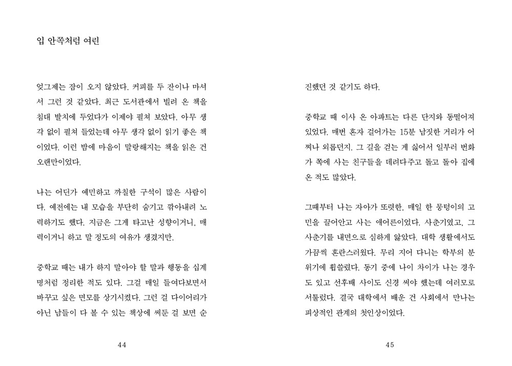 : 제 자신의 결핍이라 하면 무엇으로도 채워지지 않는 공허함을 말해요. 그건 누구를 만나도, 갖고 싶은 물건을 사도, 정말 하고 싶은 일을 해도 채워지지 않는 무언가라고 표현할 수 있는데요. 저한테는 글만이 온전하게 결핍을 채워줄 수 있는 순간을 만들어줬습니다.