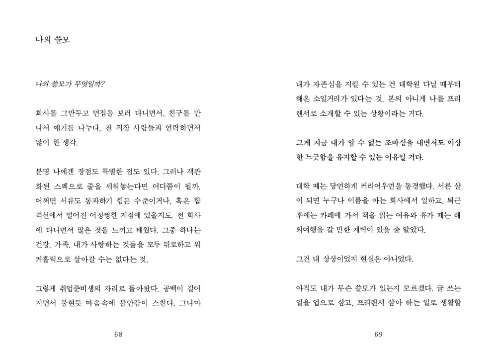 : 글을 배운 친구들이 그러하듯 직장에 들어갔었어요. 저는 첫 직장에서 홍보 및 보도 자료를 쓰는 일을 맡아서 당시에는 아무것도 읽고 쓰지 못했어요. 제가 하는 일에도 글의 에너지를 쏟고 있다보니 글이 안 써지더라고요. 회사를 갑자기 그만두게 되면서 문득 책을 내야겠다고 생각하고 원고를 모았습니다. 사실은 소설을 너무 쓰고 싶었는데 무서워서 에세이를 썼어요. 책 앞에 쓰여있듯 '소설가 지망생의 에세이 도전기'가 이 책을 잘 설명해 주는 문구라고 생각해요.