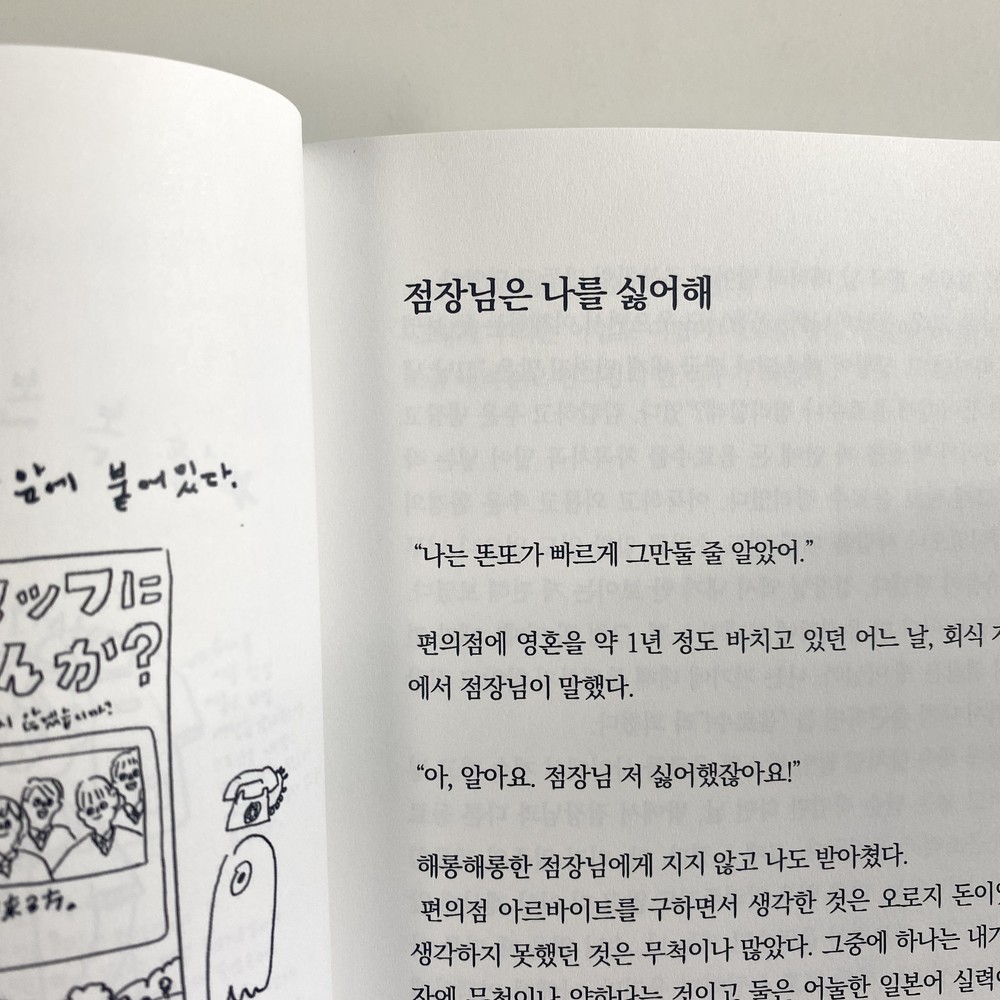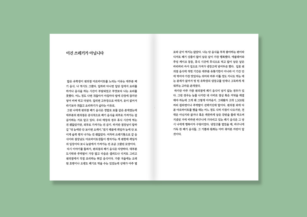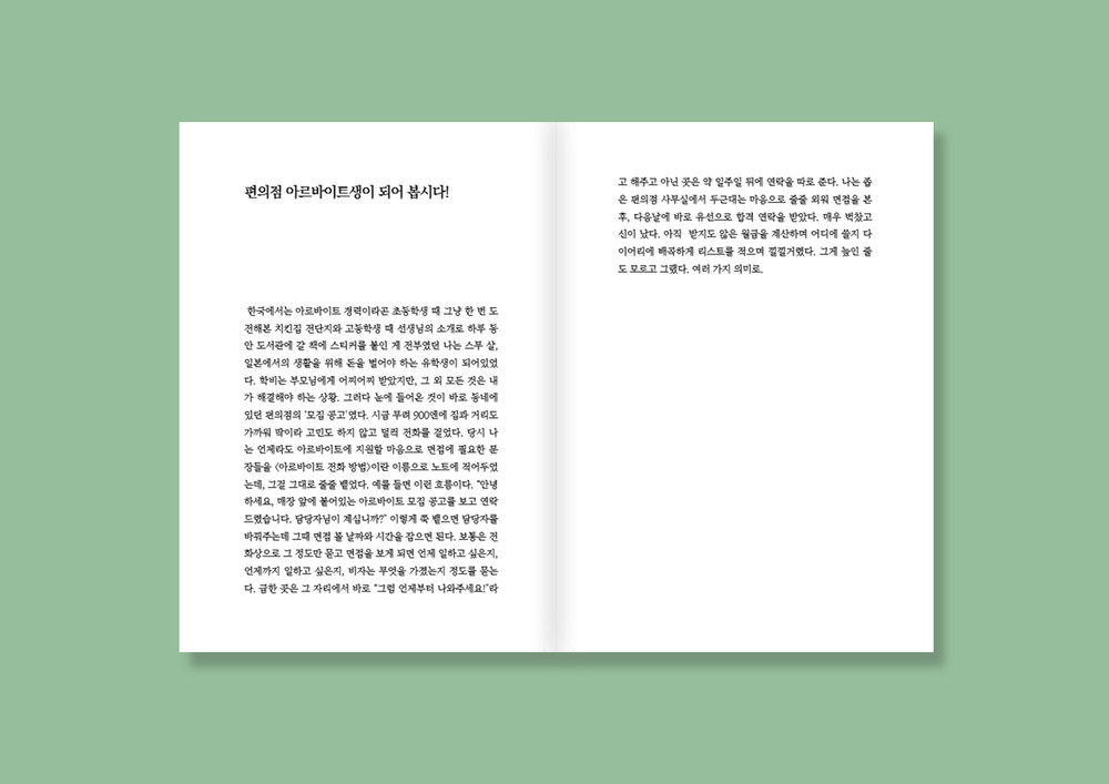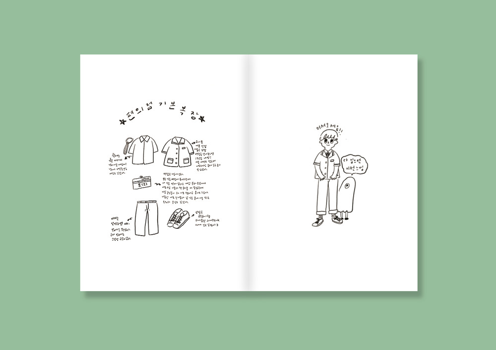 COMBINI (콤비니/편의점) 무선제본 / B6 / p. 88 / 10000원 기록을 정리하다 과거에 여기저기 끄적거린 일기장을 발견했다. 스무 살 유학시절 적어둔 내 일기장에선 그리운 냄새가 났다. 한 번 튀기면 3팩이 나오는 감자튀김, 데워진 파스타 도시락, 문을 열면 얼굴로 쏟아지던 호빵의 김, 시간 되어 체크하던 신문이 내뿜는 그런 냄새들. 그 냄새를 보여주진 못해서 뒤적이며 찾아낸 옛 기억들을 적었다. 눈물과 감동보다는 약간의 웃음과 잊고 산 열정을 담고 싶었던 일본 편의점 외노자의 고군분투 아르바이트 이야기.