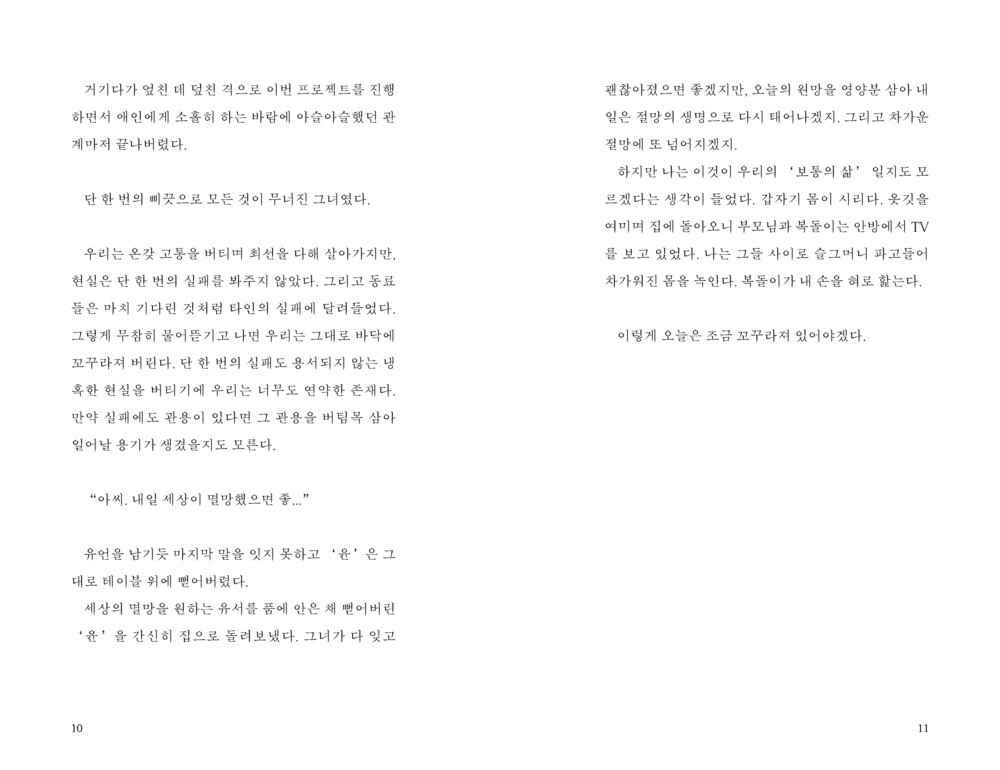 우리는 자주 꼬꾸라지기도 하고, 아슬아슬하게 버티기도 하고, 무탈히 지내기 위해 가면을 쓰기도 한다. 그리고 때론 이러지도 저러지도 못하는 애매한 인간이 되기도 한다. 사실 이 모든 것은 무거운 삶도 그렇다고 가벼운 삶도 아니다. 그저 우리의 ‘보통의 삶’일 뿐.