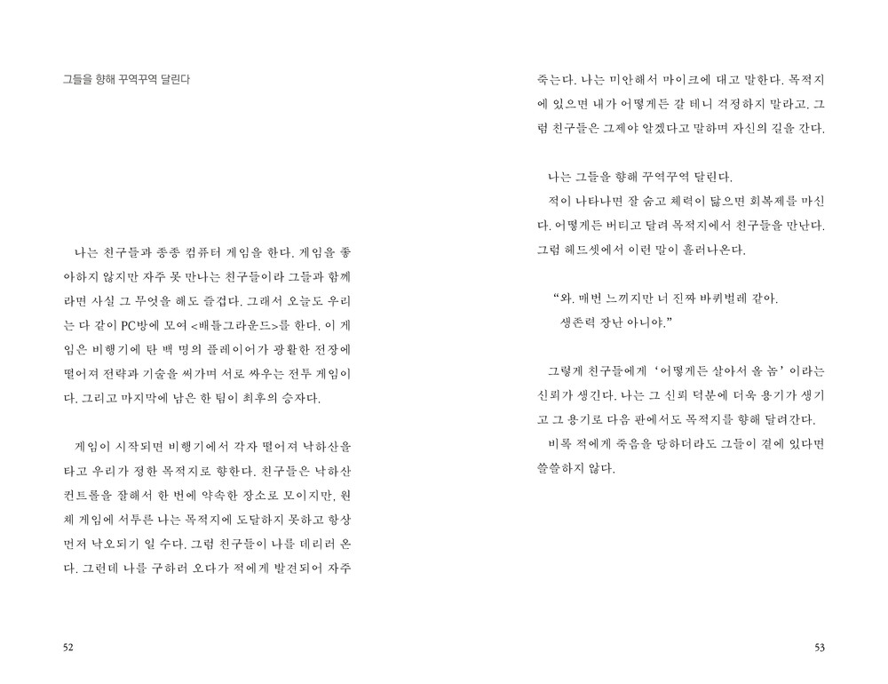 - 들어가는 말 (3p) - 매일 턱걸이 연습을 하지만 여전히 턱걸이 열 개 이상 못하는 인간이 인간관계, 사랑, 자아성찰 등을 통하여 자신의 생각을 담담히 풀어 나간 수필집.