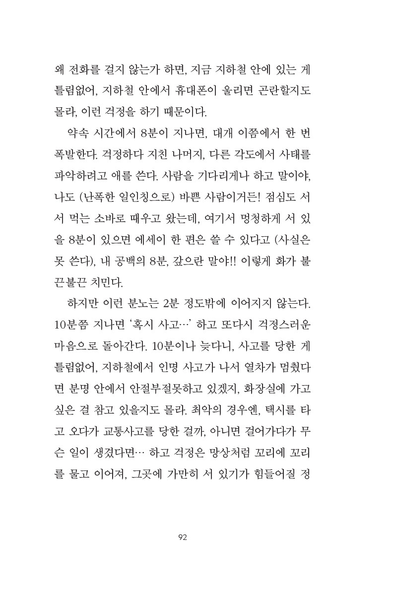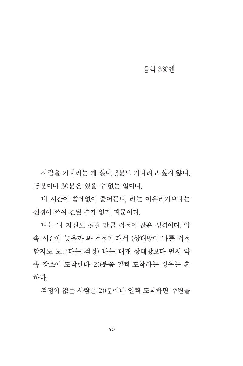 모든 것이 공백이었다. 공백투성이의 하루하루였지만, 불안하지도 초조하지도 않았다.두유 아이스커피가 있다는 것도 모를 만큼, 햇살을 받으며 하얗게 빛나는 책장이 그리워질 만큼, 왜 이렇게 나는 바빠진 걸까. 나도 잘 모르겠지만, 그때의 공백이 지금 내게 주어진다 해도 이제는 결코 예전처럼 즐거워하지도, 재미있어 하지도 않겠지.- 「공백 330엔」 중에서