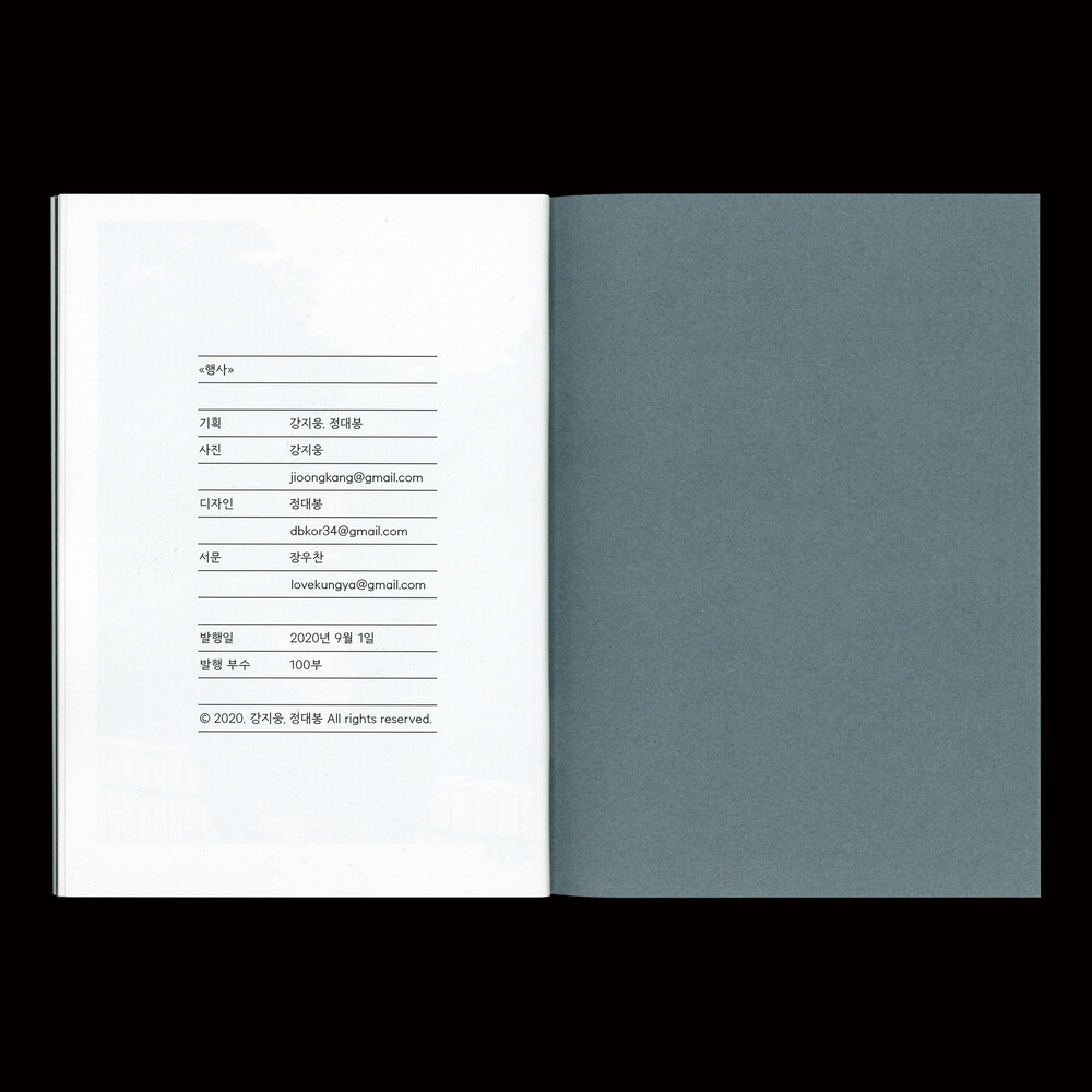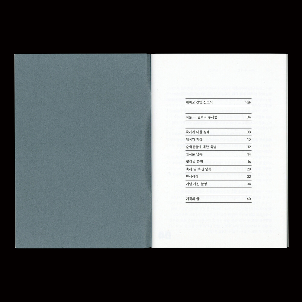 군대에서의 군인은 아주 수동적 존재에 불과하다. 목적도 모를 각종 행사에 수시로 동원되어 작위적 리액션을 요구받아온 그들은 어느새 허례허식에 누구보다 익숙해져 있었다. 이에 따라 또 하나의 형식적 행사인, 가상의 ‘예비군 전입 신고식’을 기획하고 그 진행 기록을 «행사»에 담았다. 전역과 동시에 거저 주어지는 예비군 신분을 축하하는 과장된 행사를 통해, 지금껏 빈번하게 자행되고 있는 군 내외의 각종 허례허식과 그에 대한 강요의 지점을 포착하고자 했다. 거대한 집단 아래에서 각자의 정체성이 소거된 채, 그들은 일련의 사상을 강요받는다. 그럼에도 그들은 국기에 대한 경례, 애국가 제창, 순국선열에 대한 묵념으로 이어지는 식순에 따라 그저 입술을 뻐끔거릴 뿐이다.
