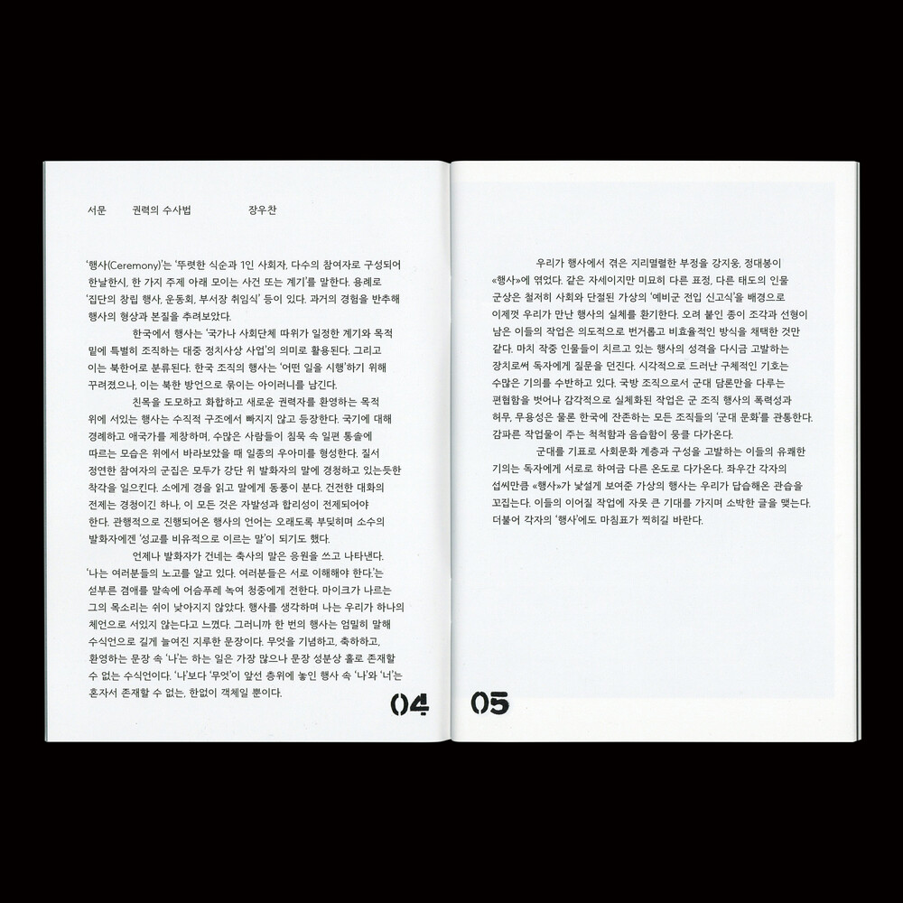 “행사를 생각하며 나는 우리가 하나의 체언으로 서있지 않는다고 느꼈다. 그러니까 한 번의 행사는 엄밀히 말해 수식언으로 길게 늘여진 지루한 문장이다. 무엇을 기념하고, 축하하고, 환영하는 문장 속 ‘나’는 하는 일은 가장 많으나 문장 성분상 홀로 존재할 수 없는 수식언이다. ‘나’보다 ‘무엇’이 앞선 층위에 놓인 행사 속 ‘나’와 ‘너’는 혼자서 존재할 수 없는, 한없이 객체일 뿐이다.” (서문에서 발췌)