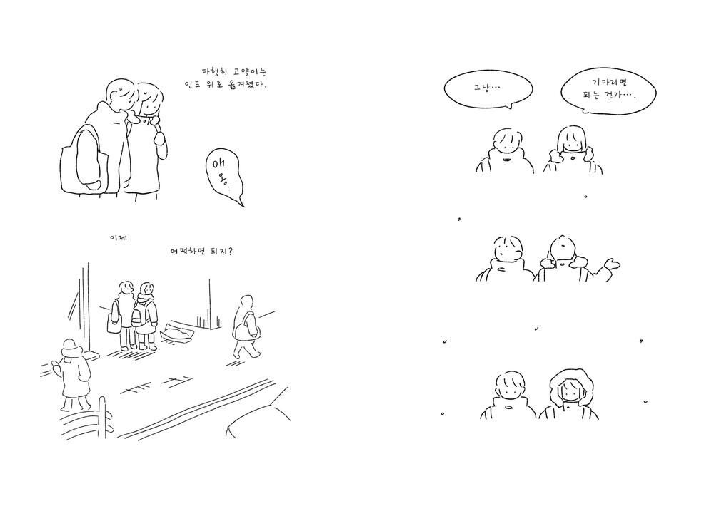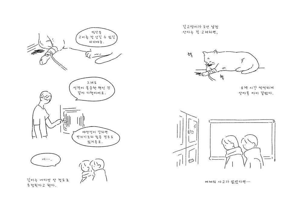 책소개:실제 로드킬 사고를 바탕으로 만든 에세이 만화입니다.한 자매가 우연히 길고양이의 교통사고를 목격한 후,고양이를 병원에 데려가, 이별하기까지의 이야기를 담았습니다.