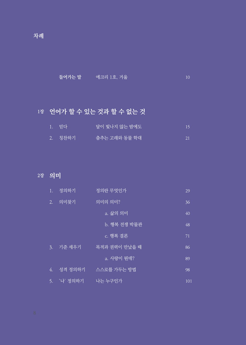 사랑이나 행복이 무엇인지, 삶의 의미는 무엇이고 나는 누구인지 알고 싶었다.그와 관련된 책들을 읽고 자료를 모아서 그것들을 정의하는 사전 같은 책을 쓰고 싶었다.그런데 그건 불가능했다.우리의 언어로는 그런 일을 할 수 없었다.이러한 고민의 과정과 결과를 나누고 싶었다.