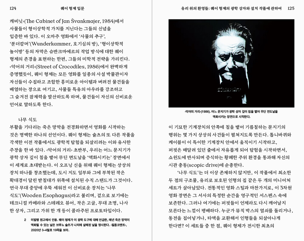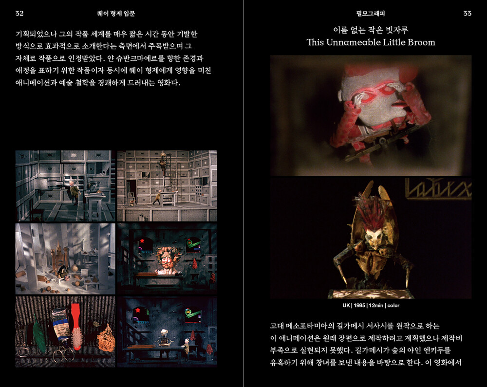 이 책은 세계 영화사에서도 전례 없는 존재, 퀘이 형제라는 일란성 쌍둥이 감독의 작품 세계를 안내하는 일종의 입문서다. 2020년 전주국제영화제가 퀘이 형제의 업적을 기리기 위해 기획한 회고전(‘퀘이 형제: 퍼핏 애니메이션의 거장’)과 특별전시(‘퀘이 형제: 도미토리움으로의 초대’) 개최에 즈음해 퀘이 형제를 이해하는 데 유용한 정보와 비평을 수록한, 한국에서는 최초로 출판되는 퀘이 형제 관련 서적이다.