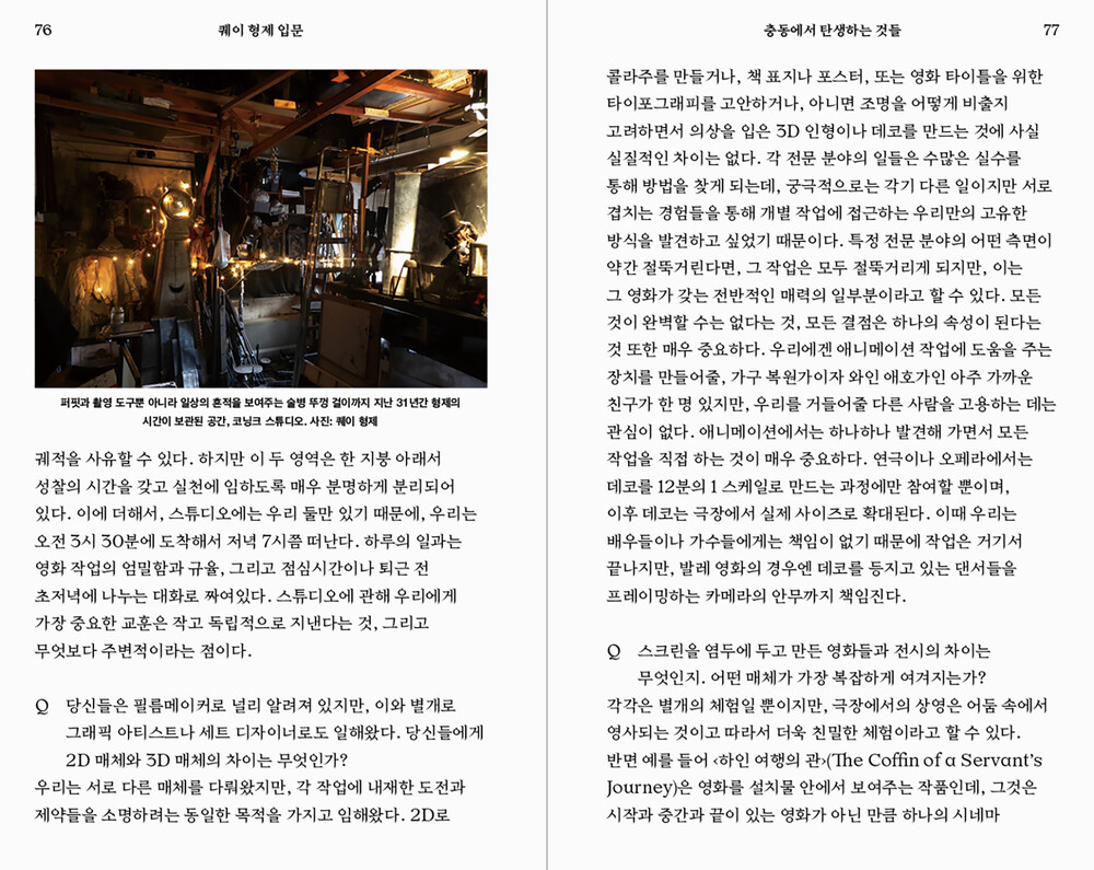 그들의 작품을 연대기적으로 소개하는 것으로부터 시작해, 형제에 관한 비평적 접근이랄 수 있는 연구자들의 기고, 역시 한국 최초가 되는 퀘이 형제 인터뷰, 그들 영화의 세트를 재현한 ‘도미토리움’이라 불리는 디오라마 세트의 세계, 그 외 그래픽 디자이너로서 경력을 시작한 이래 생산한 초기 시각 작업물 등을 폭넓게 포괄해 입문서에 걸맞은 다양한 정보를 담았다.