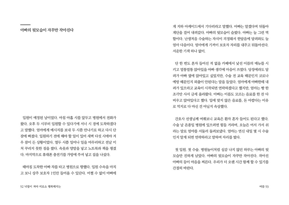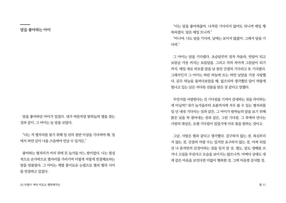 산문집 <낙엽이 져야 비로소 행복해지는>은 계절 따라 짙어지고 옅어지는 감성과 이성을 적은 책입니다. 한 사람의 감정이 피었다가 사그라들고, 다시 굳건히 돋아나는 과정에서 건네는 위로와 공감을 담았습니다.