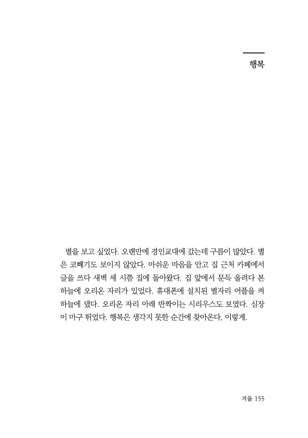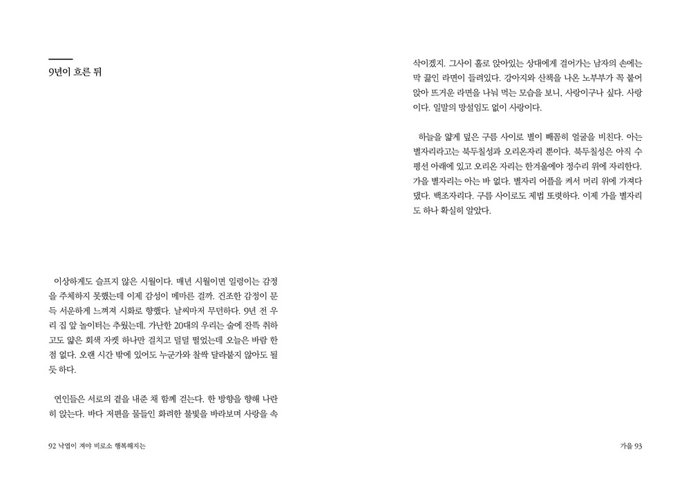 늘 적당한 우울을 안고 살고 있다. 봄과 여름에 무럭무럭 자라난 우울은 낙엽처럼 힘없이 떨어져 가을 바람에 이리저리 휘날리며 바닥을 쓸다 이내 바스라진다. 차디찬 겨울 공기가 옷깃을 스칠 즈음에야 옅은 미소를 띠지만, 다행히도 올해는 꽤 괜찮은 가을을 보내는 중이다.