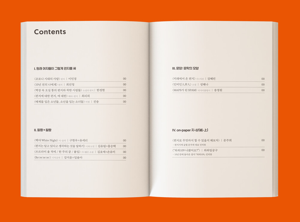 4부 on-paper 지-상(紙-上)에서는 인터뷰를 통해 편지의 의미와 정서, 추억의 색과 온도에 대해 이야기를 나눠보았다.연희동 편지 가게 ‘글월(geulwoll)’ 운영자 문주희 대표 인터뷰 〈편지로 무엇까지 할 수 있을지 해보자〉와 문학스튜디오 무시 팀이 인터뷰에 덧붙인 답장 편지. 10년 만에 한정판으로 돌아온 추억의 잡지 《와와109》의 이야기를 담은 인터뷰 〈“와와109 나왔어요?”〉가 실려 있다.