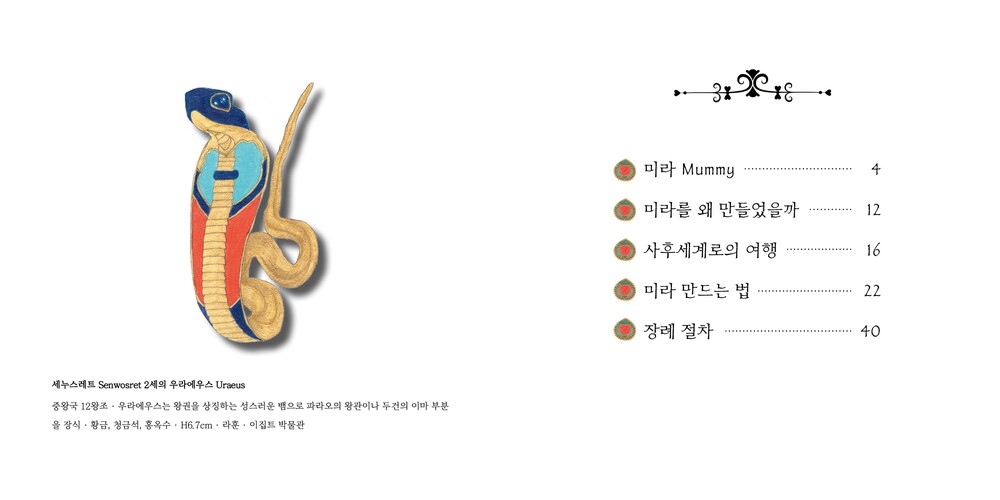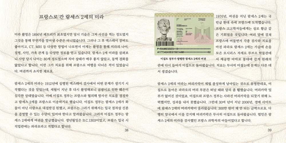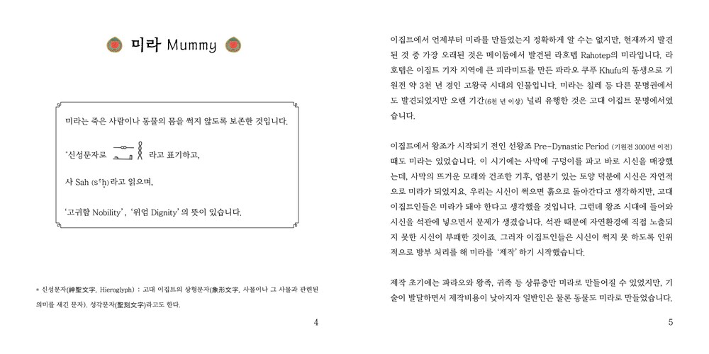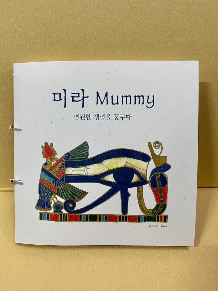 책의 내용 : 책은 미라가 무엇인가에서 시작해서 그들이 미라 만들기에 왜 집착했는지, 그들이 생각했던 사후 세계는 어떤 것인지로 이어집니다. 우리가 생각하는 영혼이라는 개념을 고대 이집트인들은 ‘바“, ”카“등 조금 더 여럿으로 나누어 생각했는데요, 이것을 이해하고 간략하게 풀어내는 데 어려움이 있었습니다. 이집트에 처음 관심을 가졌던 때부터 지금까지 바와 카는 저에게도 풀기 어려운 문제입니다. 풀어도 풀어도 계속 틀리는 기분입니다. 미라는 바와 카에 대해 알고 나면 조금 더 흥미롭게 다가오는 이야기라 어렵긴 하지만 최대한 간단히 적어보려고 노력했습니다. 마지막 장은 미라 만드는 방법과 장례 절차, 부장품, 부적 등에 관한 이야기로 마무리됩니다. 책에 실린 모든 그림은 색연필과 반짝이 붓펜을 이용해 그렸습니다.