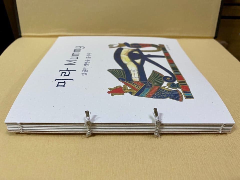 바인딩 이야기 : 책등에 노출된 코드(노끈)를 실이 감싸고 지나가는 방식으로 엮었습니다. 코드는 책등 폭보다 여유 있게 잘라 양 끝을 실로 총총 감아 멋내기를 해 보았고 코드의 끝은 풀리지 않도록 밀가루 풀로 마무리하였습니다. 사용된 코드와 실은 아마 100%로 만들어진 것을 사용했습니다. 아마는 미라를 감을 때 사용하는 붕대를 만드는 재질이라 이번 책과 안성맞춤이라고 생각하며 혼자 흐뭇해했습니다. ^^