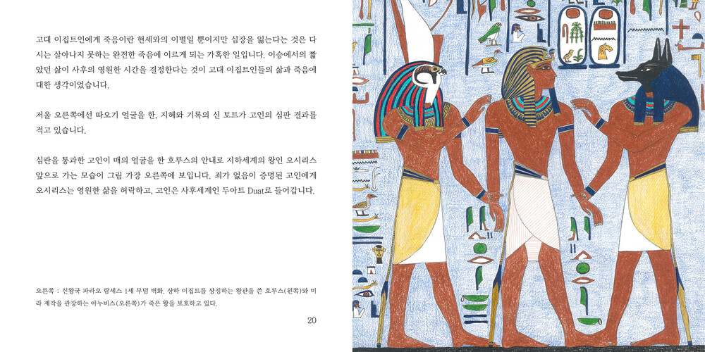 책을 만들게 된 이야기 : 일 년 전쯤 반려견 꽃순이를 아무런 준비 없이 황망하게 보내게 된 일이 있었습니다. 시간을 되돌리고 싶다는 생각을 수도 없이 하며 후회를 했었지요. 어떤 사람들은 떠나간 반려동물이 환생해 다시 나에게 오기를 바라기도 하고, 실제로 그런 것이 틀림없다며 운명처럼 다른 동물을 만나기도 한다고 들었습니다만 저는 아무리 생각해도 그 녀석이 저에게로 다시 올 것 같지는 않았습니다. 제가 정말로 잘못한 것이 많았거든요. 난 꼭 한 번만이라도 다시 보고 싶은데 그 녀석이 환생하면 나는 죽어서도 다시 볼 수 없겠구나 싶어 절망하다가 문득 떠오른 것이 고대 이집트인들의 생사관이었습니다. 그들에게는 환생이 없습니다. 이승에서 오직 한 번의 삶이 있을 뿐이고 신분 상승이나 인생 역전도 없으니 어쩌면 나는 죽어서 꽃순이는 물론 뽀비, 이쁜이, 똘똘이, 해피, 바둑이, 나비..... 모두 만날 수 있지 않겠냐는 희망이 생겼습니다. 네, 그때의 저에게 그것은 분명히 커다란 희망이었고, 다시 무언가를 시작할 수 있게 해 준 원동력이었습니다.