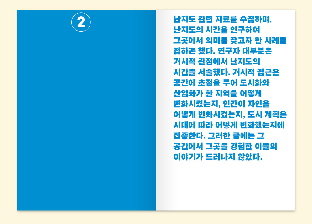 난지도 관련 자료를 수집하며, 난지도의 시간을 연구하여 그곳에서 의미를 찾고자 한 사례를 접하곤 했습니다. 연구자 대부분은 거시적 관점에서 난지도의 시간을 서술했습니다. 거시적 접근은 공간에 초점을 두어 도시화와 산업화가 한 지역을 어떻게 변화시켰는지, 인간이 자연을 어떻게 변화시켰는지, 도시 계획은 시대에 따라 어떻게 변화했는지에 집중합니다. 그러한 글에는 그 공간에서 그곳을 경험한 이들의 이야기가 드러나지 않았습니다.