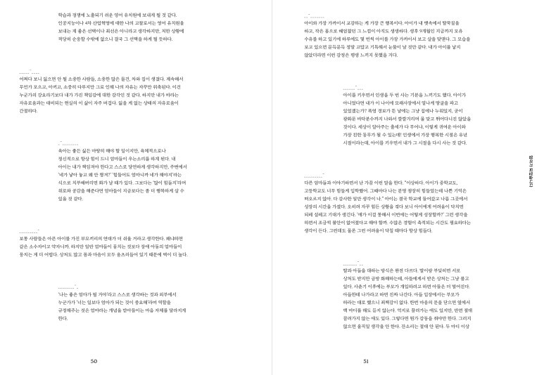 한때는 먹먹했던 바다에서 차분히 유영하고 여유롭게 프리다이빙을 즐길 수 있는 엄마가 서서히 되어가겠지만, 자주 예상을 빗나가는 자연이 그러하듯 한창 익숙해진 바다가 언제 나를 꿀꺽 삼킬지도 모를 일이다. 맞닿아 있는 바다도, ‘엄마!’라고 부르는 상대도 서로 다르지만, 아마도 누군가의 엄마로 영원히 남을 우리의 기록을 남겨본다. - 44쪽