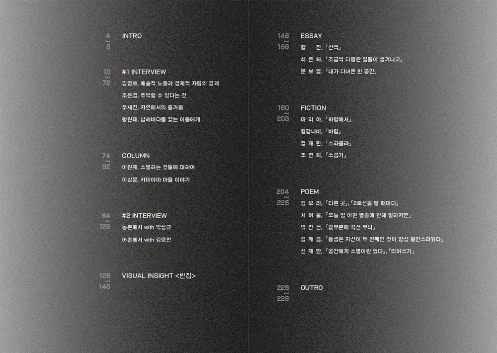 로컬 라이프스타일 탐구지 「우리가 소멸하는 방법」은 지방도시소멸이슈를 중심으로 인터뷰, 칼럼, 사진, 문학 등 다양한 이야기를 담은 무크지(Magazine+Book)입니다.
