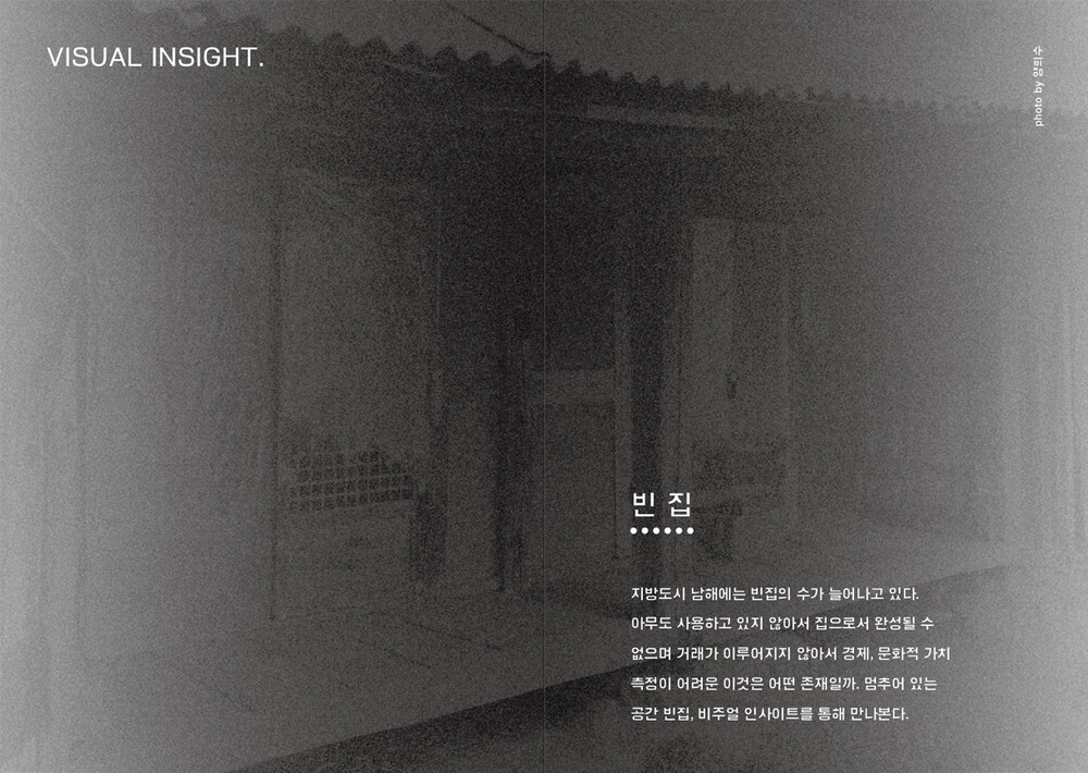「우리가 소멸하는 방법」 1호 비주얼 인사이트(Visual insight) 키워드는 ‘빈집’입니다. 시골 동네를 가볍게 걷다 보면 흔하게 볼 수 있는 빈집이 눈에 띕니다. 빈집은 허물어 버릴 수도, 사용할 수도 없는 존재입니다. 빈집의 상태는 사용된 자재와 시간의 축척을 따라서 각각이 독특한 이미지를 만들어 냅니다. 누군가가 살아온 흔적이 남아 있기도 하고 물건들의 너저분한 배열과 함께 창고로 사용되기도 합니다. 흔적과 물건들이 존재함에도 ‘빈집’이라는 지위를 잃지 않는다는 사실은 시각적으로도 우리에게 특별한 인사이트를 줄 수 있습니다. 물리적인 공간의 기능이 ‘집’의 목적을 가지고 있다면 그 안에 채워지는 것 역시 ‘집’에 걸맞은 무언가 이겠지요. 현재의 빈집에 작은 이야기를 채웁니다.