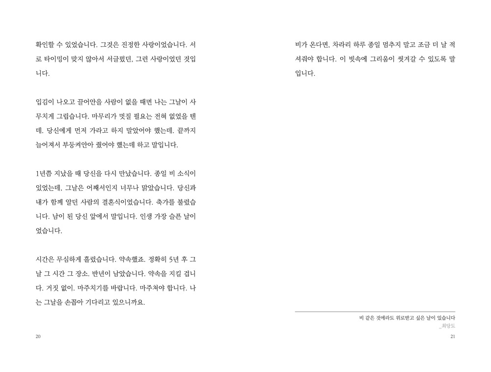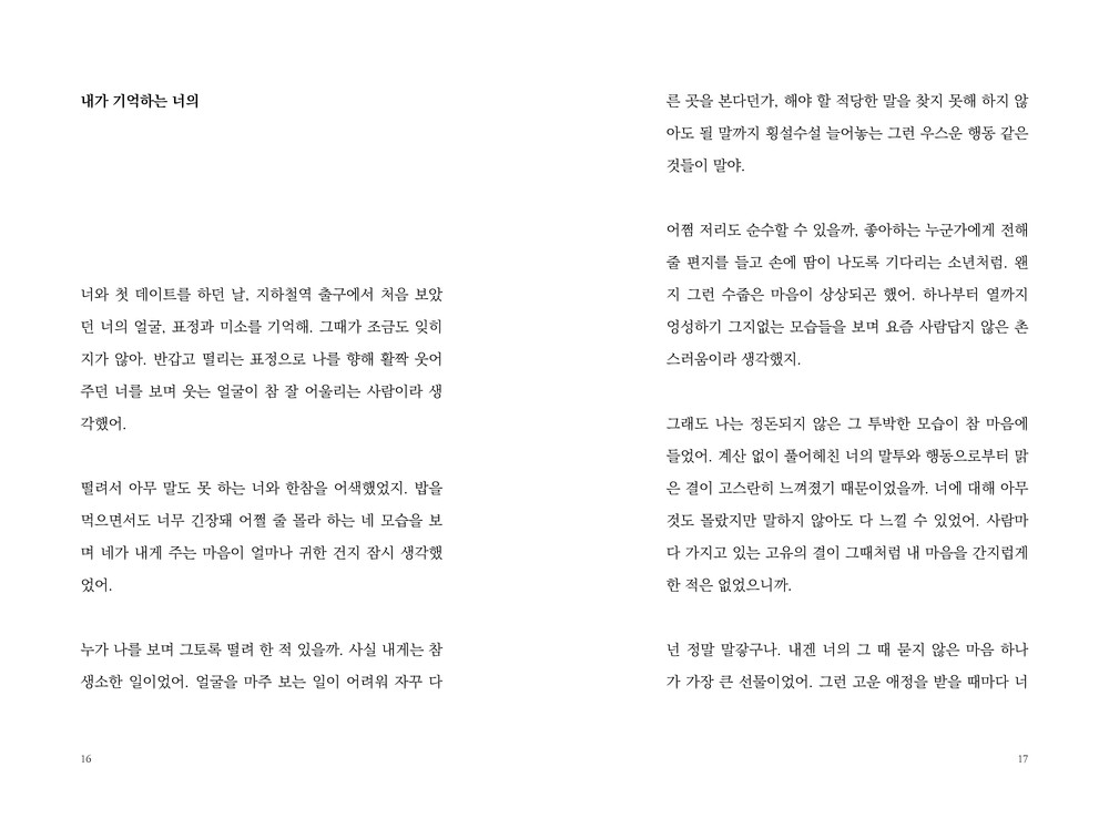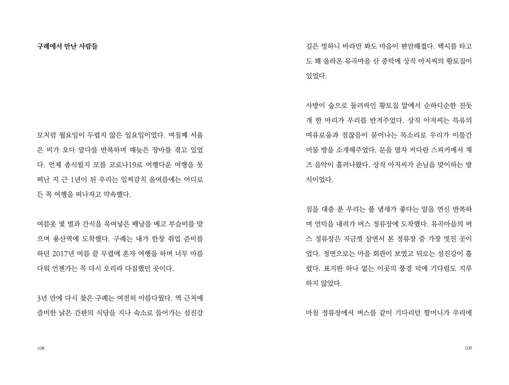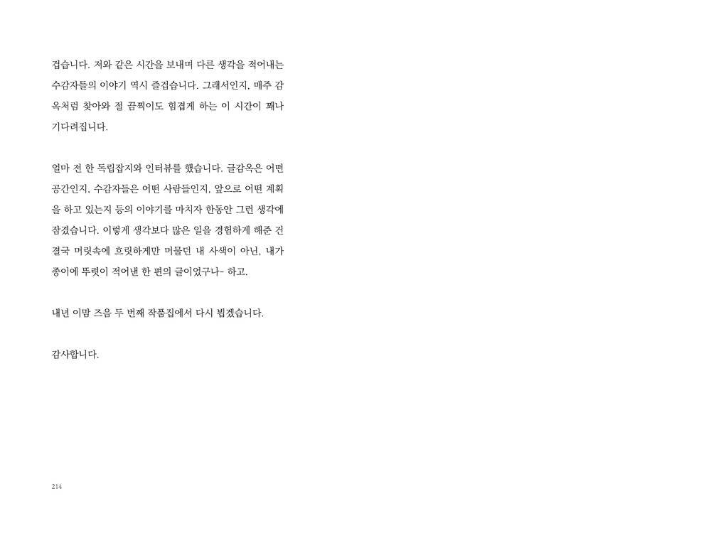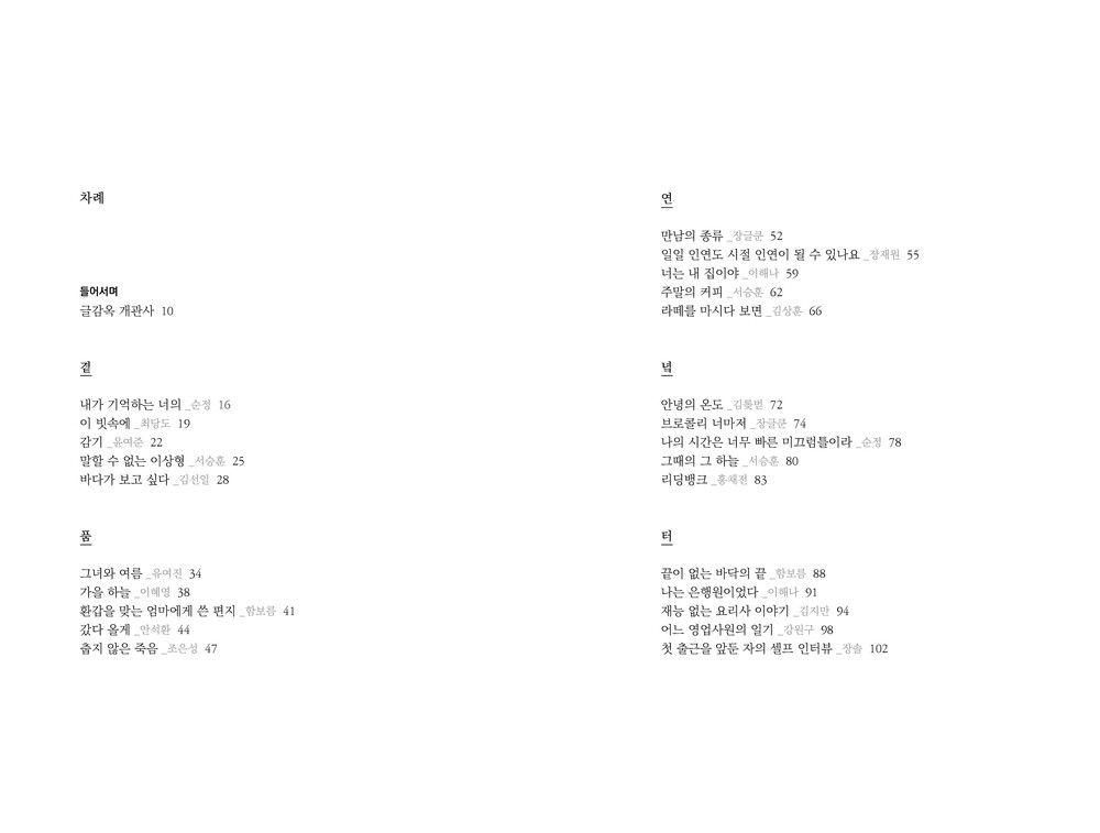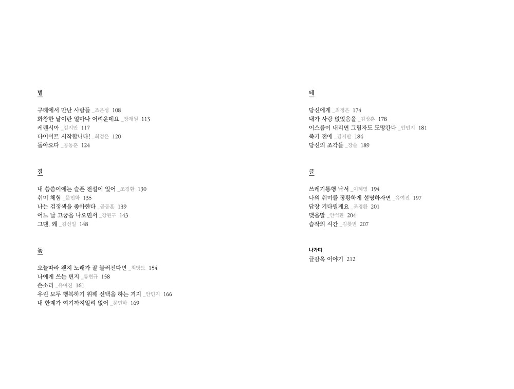 이번 단행본에서는 2019년 8월 개관 이후 글감옥에 쌓인 861편의 글 중 50편의 이야기를 담았습니다. '곁·품·연·녘·터·볕·결·돛·테·글'이라는 10개의 틀과 어울리는 5편의 글이 각각 스며 있습니다.