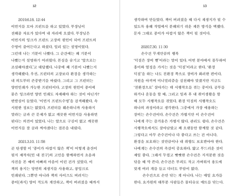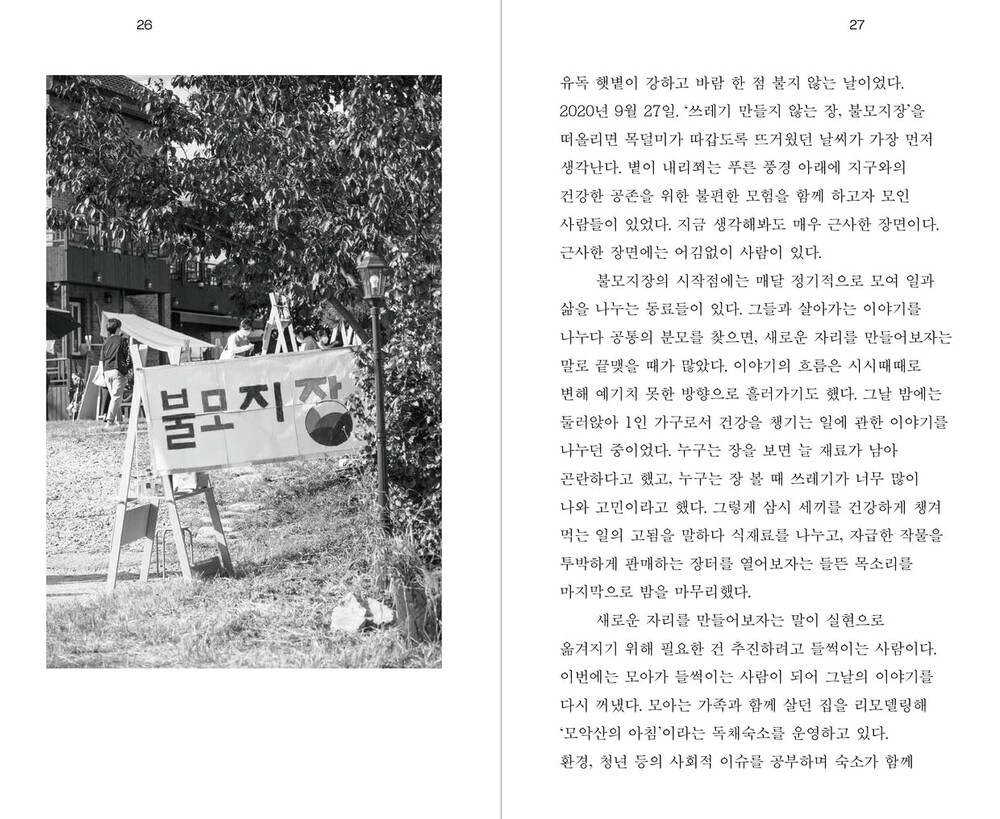 ‘환경’을 주제로 한 에세이를 쓰기 위해 12명의 필진이 모였습니다. 모임에 나온 이들 중에는 환경실천에 대해 공부하고 있는 이도 있었고, 환경문제에 대해 크게 고민해본 적은 없지만 자연을 바라보면 그저 좋아서 참여한 이도 있었습니다. 친구들이 환경 이야기를 꺼낼 때마다 자기는 환경에 대해 잘 모르는 것 같아 부끄러워 모임을 참여한 이도, 환경 관련 에세이가 기후위기와 환경오염 이야기로만 가득해 조금 다른 말을 해보고 싶은 이도 있었습니다. 저마다 모임에 온 이유도 달랐고 각자의 긴급함도 달랐습니다. 그렇게 모임에 나온 이유와 동기만을 공유한 채, 통일된 의견에 대한 강박, 의무적인 만남 없이 12명의 필진은 자신의 삶을 벗어나지 않으면서 결코 하나로 묶일 수 없는 다양한 환경 생각이 담긴 열두 편의 에세이가 만들어졌습니다.