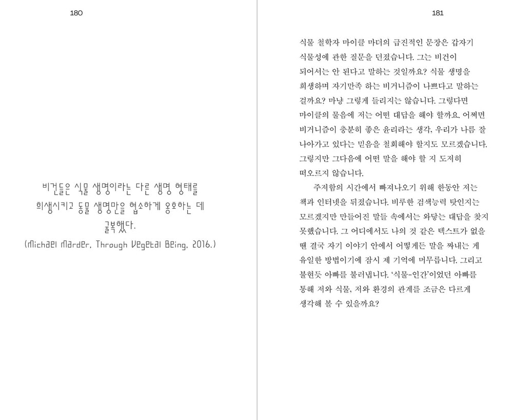 반면 식물은 인간으로 하여금 죄책감을 주지 않는 방식으로, 죽음을 담지하지 않은 방식으로 자기자신을 줍니다. 저는 이를 ‘선물’이라고 부르려 합니다. 식물의 선물은 우리에게 윤리적 울림을 일으키지 않습니다. 죽음을 담지하지 않기에 식물은 무조건적인 책임을 요구하는 방식으로 선물을 주지 않습니다. 식물은 인간이 소화할 수 있는 에너지를 자신의 고통을 담지하지 않은 조건없는 선물의 형태로 건네줍니다.