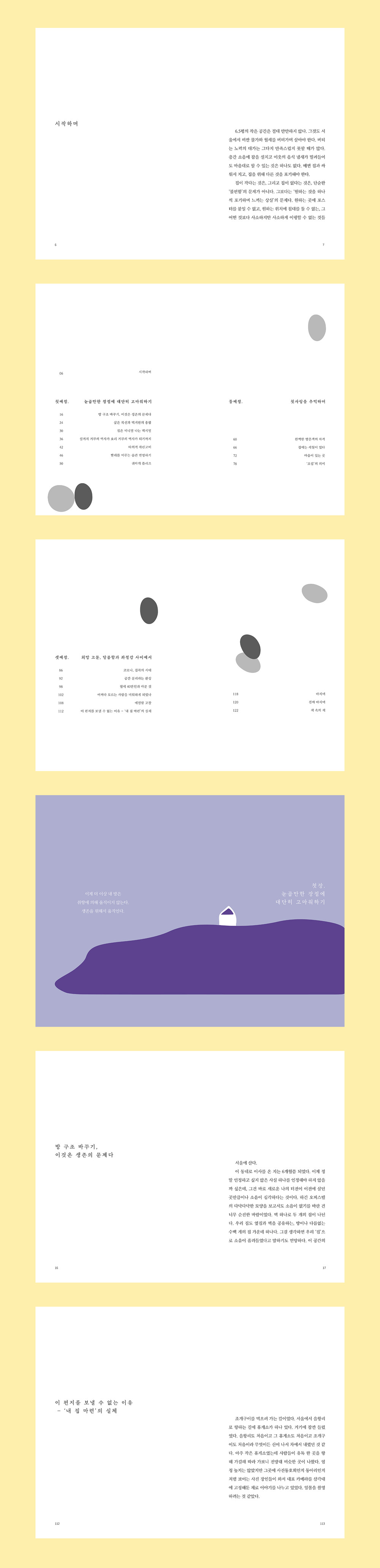 시작하며1장. 눈곱만한 장점에 대단히 고마워하기방 구조 바꾸기, 이것은 생존의 문제다삶은 복선과 맥거핀의 총합집은 미니멀 나는 맥시멀설거지 거부의 역사가 요리 거부의 역사가 되기까지타의적 자린고비빨래를 미루는 습관귀마개 플리즈2장. 첫사랑을 추억하며완벽한 방문객의 자격집에는 세월이 있다마음이 있는 곳‘조립’의 의미3장. 희망 고문, 달콤함과 좌절감 사이에서코로나, 집콕의 시대공간분리라는 환상월세 40만 원과 바꾼 것어쩌다 모르는 사람을 미워하게 되었나예민함 고찰이 편지를 보낼 수 없는 이유 – ‘내 집 마련’의 실체마치며진짜 마치며책 속의 책