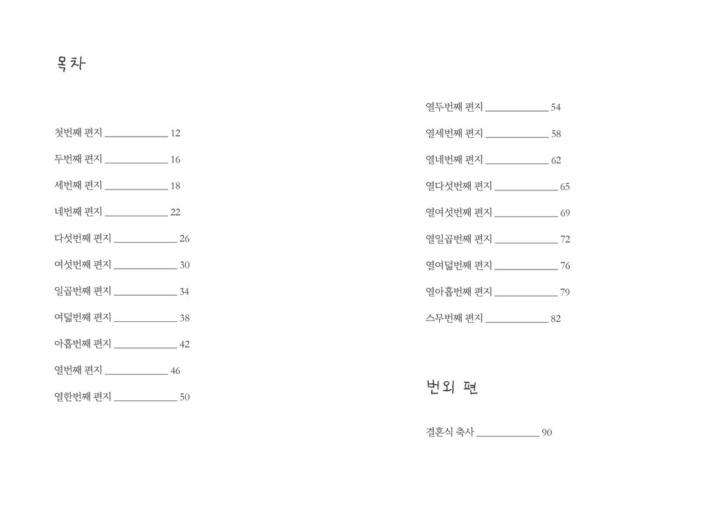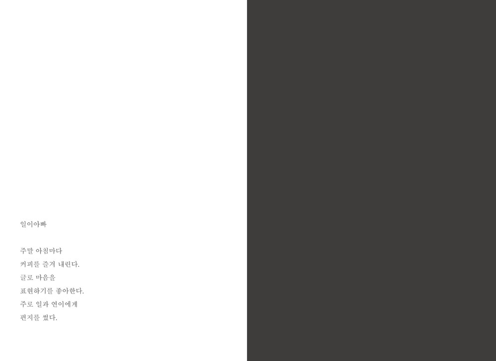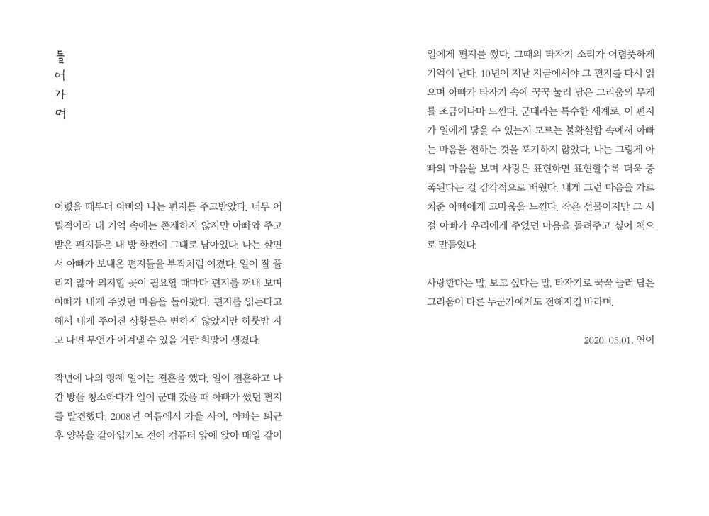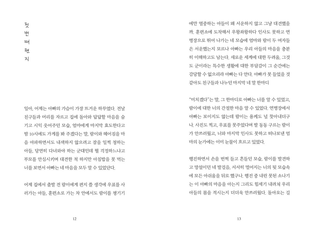 12년 전, 일이 훈련소에 있는 동안 아빠는 일에게 매일 같이 편지를 썼습니다. 군대라는 특수한 세계로, 이 편지가 일에게 닿을 수 있는지 모르는 불확실함 속에서 아빠는 계속해서 마음을 전했습니다. 아빠의 편지를 보며 사랑은 표현하며 표현할수록 더욱 증폭된다는 것을 감각적으로 배웠습니다. 그 시절 아빠가 우리에게 주었던 마음을 돌려주고 싶어 만든 책입니다.