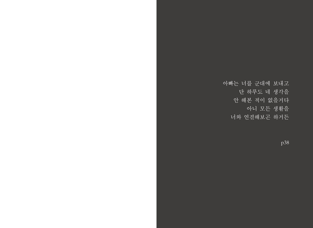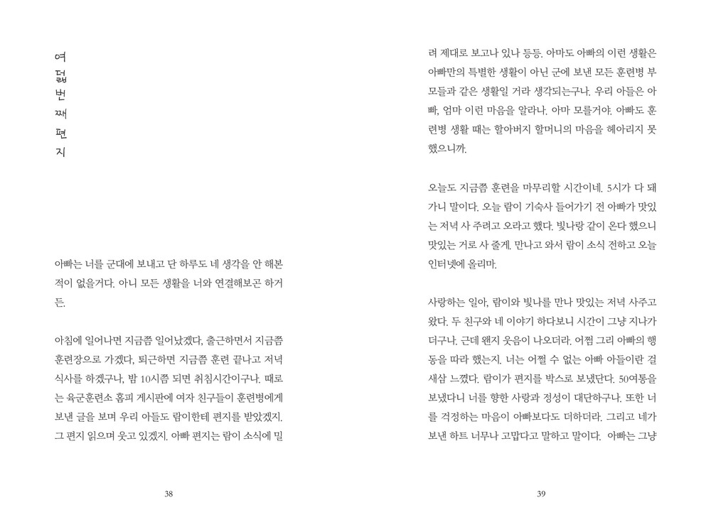 “아빠는 너를 군대에 보내고 단 하루도 네 생각을 안 해본 적이 없을 거다. 아니 모든 생활을 너와 연결해보곤 하거든” p38