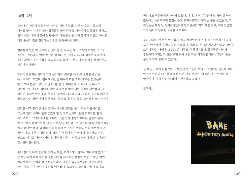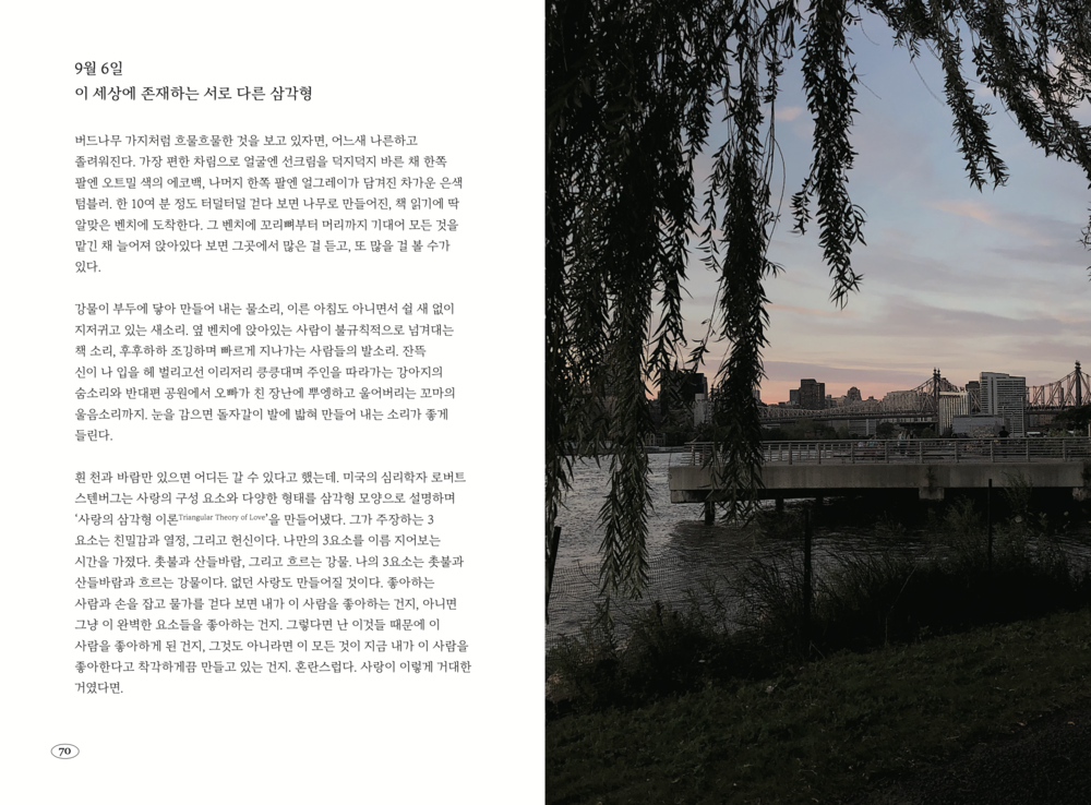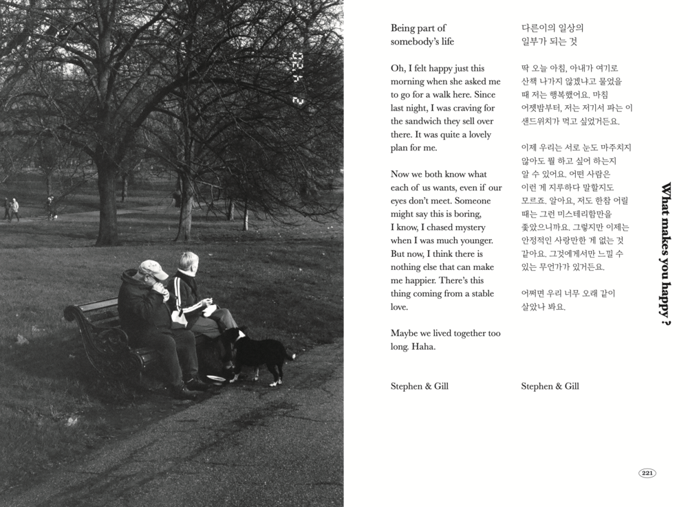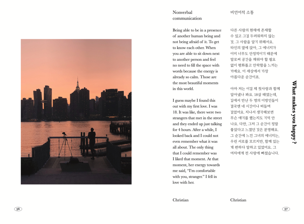 한 도시에서 어느 사회에도 소속되지 않고 오랜 시간을 이방인으로 여행하며 사는 도중에는 정말 당연하게도 우울의 순간들이 찾아왔습니다. 그럴 때마다 저는 이 프로젝트를 곱씹으며 힘을 얻었어요. 부정적인 생각이 들 때마다 뉴욕, 파리, 런던 할 것 없이 카페나 공원을 찾아 인터뷰 녹음 파일을 정리하고 일기를 썼어요. 그러다보니 신기하게도 어느새, 제 질문에 답을 해준 사람들의 좋은 기운이 전해지는 것을 느낄 수 있었습니다. 저는 긍정적인 이야기가 가진 힘을 믿는답니다. 그걸 한 데 묶고 싶었어요 !