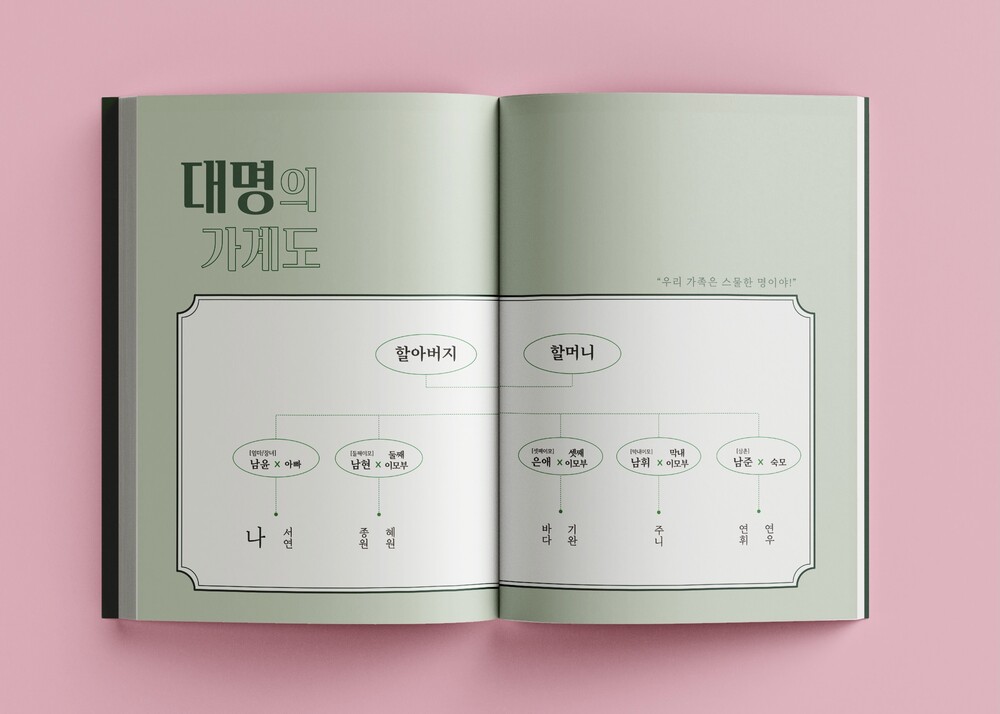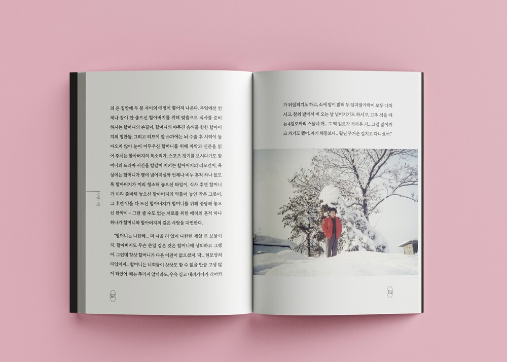책에는 프롤로그, 차례, 가계도, 5개의 챕터와 21개의 글 그리고 옛날느낌 물씬 나는 필름카메라 사진이 들어있습니다. (글의 갯수와 가족 인원수는 연관이 없습니다. 우연의 일치일 뿐 21명 모두의 개인사를 담고 있지는 않습니다.)