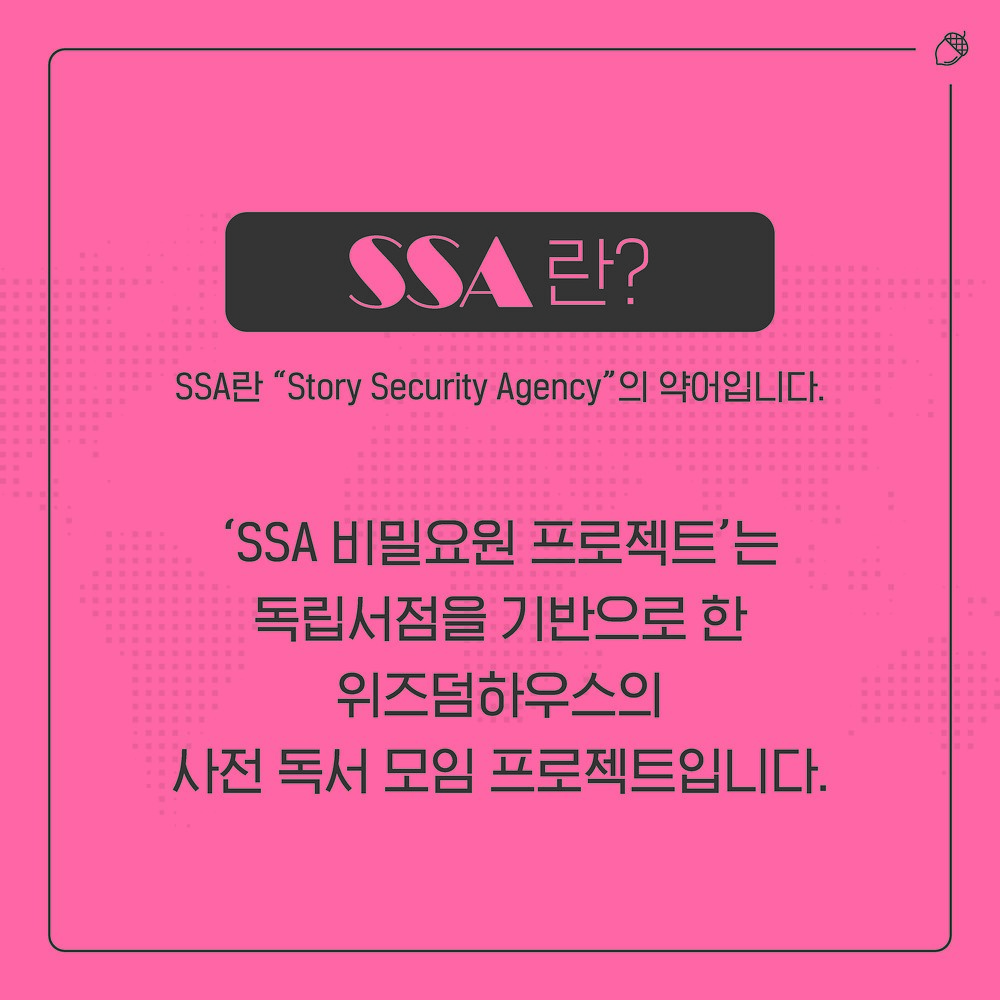 'SSA 비밀요원 프로젝트'는 독립서점을 기반으로 한 위즈덤하우스의 사전 독서 모임 프로젝트입니다.