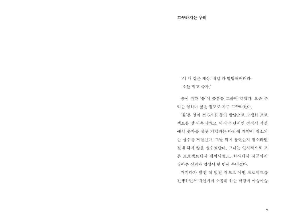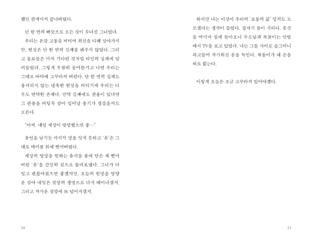 우리는 자주 꼬꾸라지기도 하고, 아슬아슬하게 버티기도 하고, 무탈히 지내기 위해 가면을 쓰기도 한다. 그리고 때론 이러지도 저러지도 못하는 애매한 인간이 되기도 한다. 사실 이 모든 것은 무거운 삶도 그렇다고 가벼운 삶도 아니다. 그저 우리의 ‘보통의 삶’일 뿐.