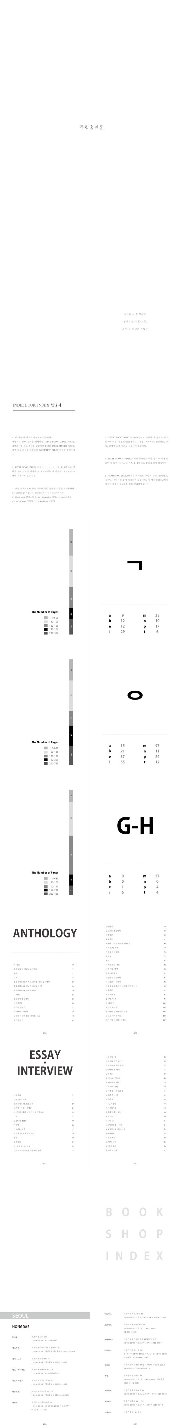2. 인디북 인덱스 파트는 ㄱ , ㄴ , ㄷ / A, B, C순으로 정리가 되어 있으며, 섹션별 첫 페이지에는 책 종류별, 페이지별 수량이 기대되어 있습니다.