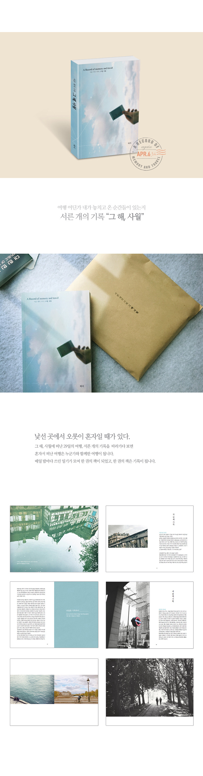 <그 해, 사월>은 혼자 떠난 첫 유럽여행의 처음이라는 불안감과 29일간의 일정을 서른 개의 단락으로 남긴 기록문입니다. 매일 밤마다 쓰던 일기가 모여 한 권에 책이 되었고, 그것은 희미한 기억을 완전하게 만드는 과정이 되었습니다. 그 해, 사월이 다시 사월이 되는 순간 잊고 있었던 그때의 시간들이 선명해집니다.