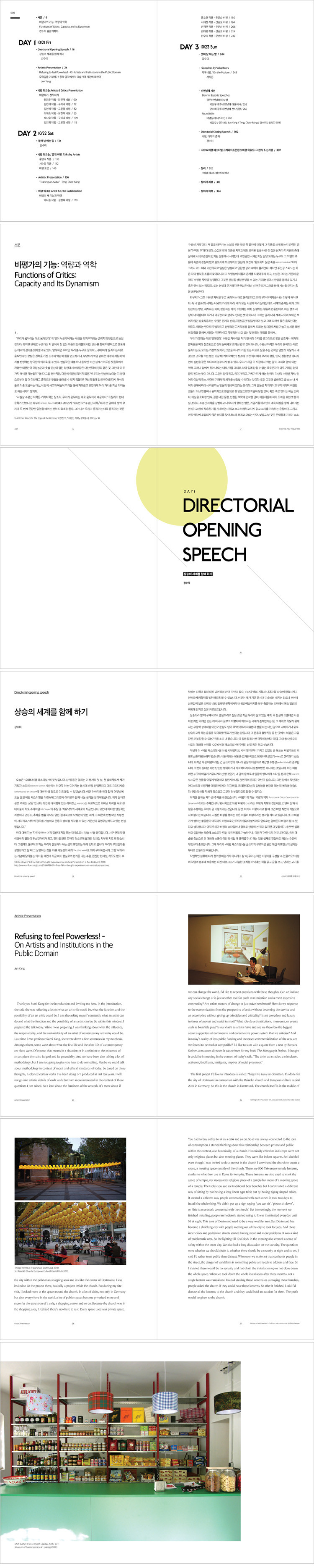 한 문장으로 간단하게 말하자면, 예술가는 서비스를 제공하는 사람이 아니며, 기존의 것들을 확언해서는 안 되고, 사회적, 문화적 쟁점들에 비판적 자세를 취하는 사람이라고 생각합니다. 이러한 자세는 장소 특정적 프로젝트로 표현할 수도 있겠지만, 또한 글쓰기, 회화, 영화 등 다양한 예술적 방법으로 표현할 수 있습니다. - 준 양 / 예술가 <무력감을 거부하기! 공적 영역에서의 예술가와 기관에 대하여 中>