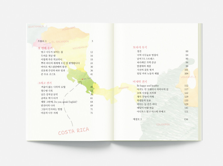 세계에서 가장 행복한 나라로 몇 번이나 1위에 오른 나라, 캠퍼스에 나무늘보가 사는 나라, 좀 느려도 되는 나라, 코스타리카에서의 따뜻한 경험을 중남미의 강렬한 색감과 함께 바로 옆에서 들려주는 것처럼 생생하고 따뜻한 문장으로 느껴 보세요 :)