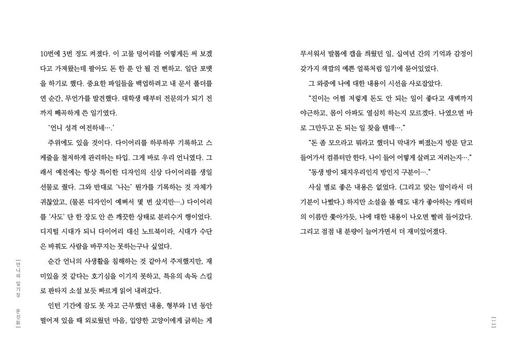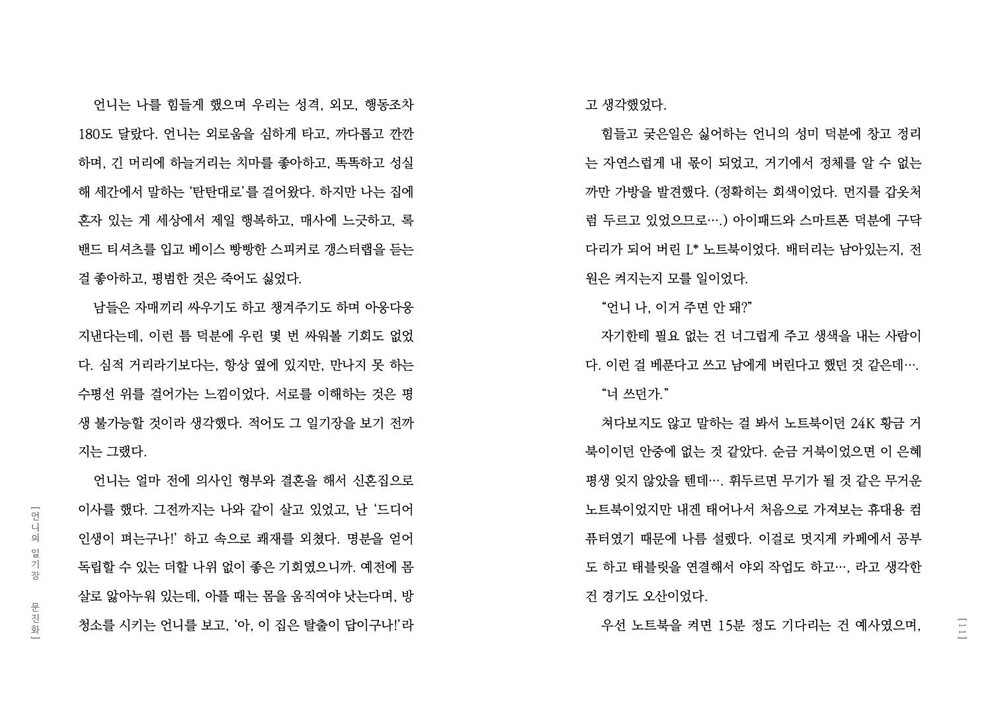 하나부터 열까지 맞는게 없는 언니. 작가는 우연히 언니의 일기장을 보게 됩니다. 언니의 일기장에 쓰여진 본인에 대한 이야기에 보니 스멀스멀 뭔가가 치밀어 오릅니다. 하소연과 투정과 변명. 그리고 조금씩 드러내는 그녀의 고민들이 '나만 그런게 아니었구나.'하는 공감을 이끌어 냅니다.