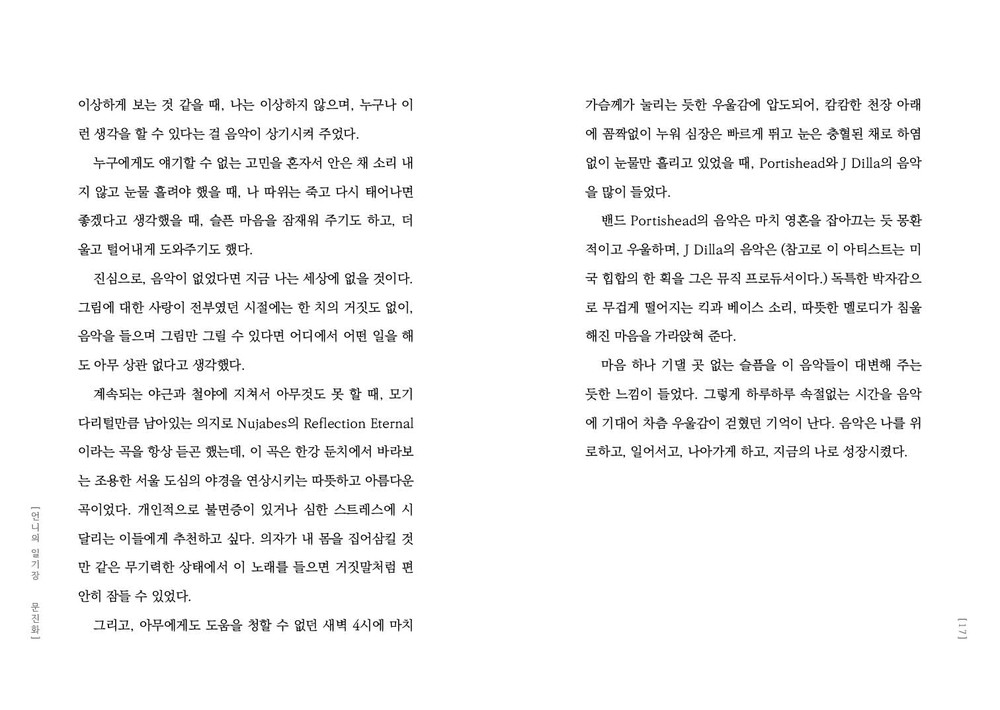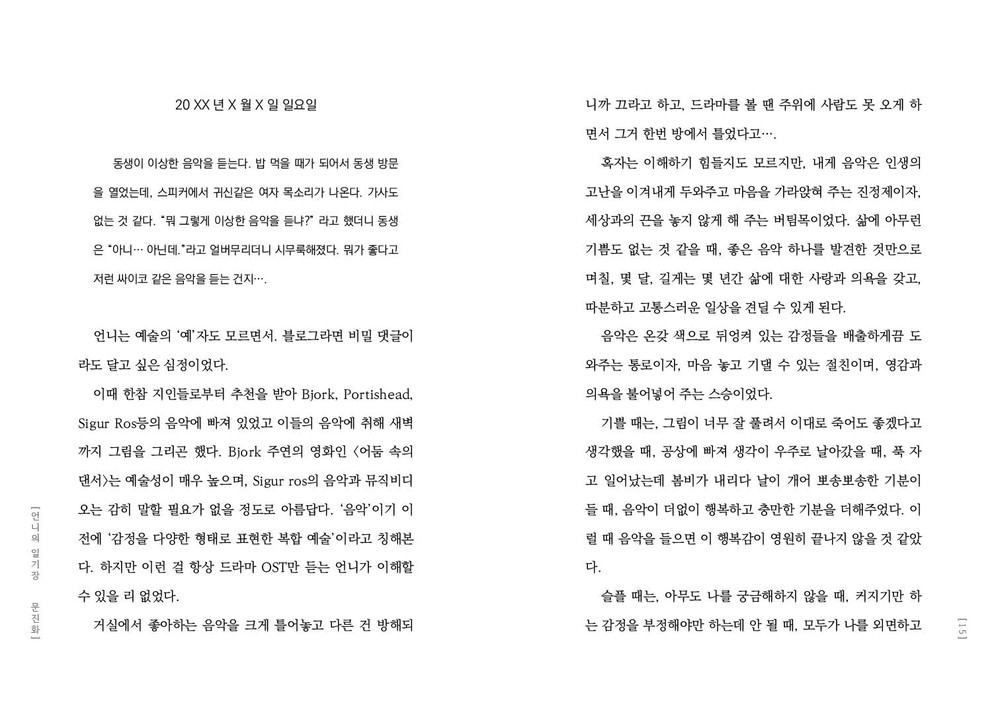 진화 작가는 우연히 훔쳐본 언니의 일기장 속에서 자신에 대한 내용을 발견하고, 언니의 말에 하소연하 듯 그 동안 해왔던 고민들을 슬그머니 풀어 놓습니다. 요한 작가는 10대 시절 처음 음악 접했을 때부터, 지금까지 음악에 대한 자신의 감정과 태도를 진솔하게 이야기합니다.