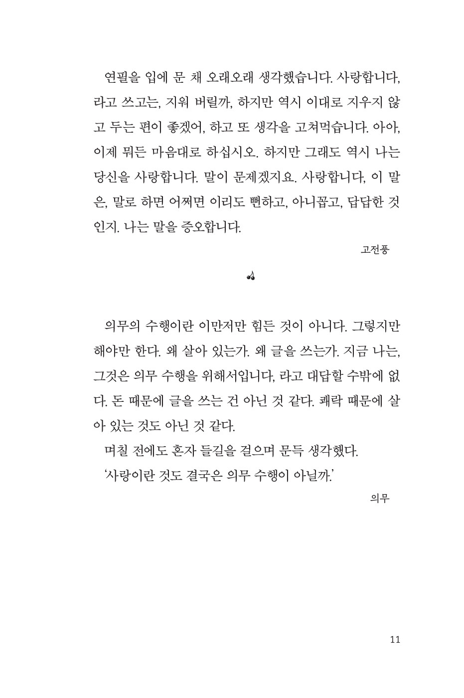 좋아하고 싫어하는 것은 논리가 아니다. 당신이 나를 도와주었기 때문에 좋아하는 것도 아니고, 당신이 멋쟁이라서 좋아하는 것도 아니다.