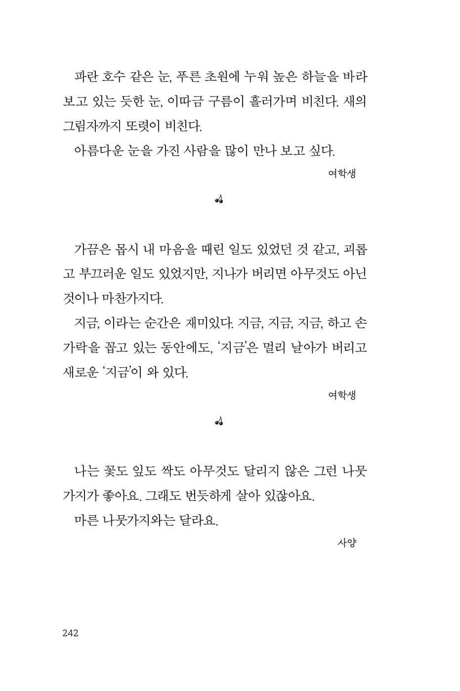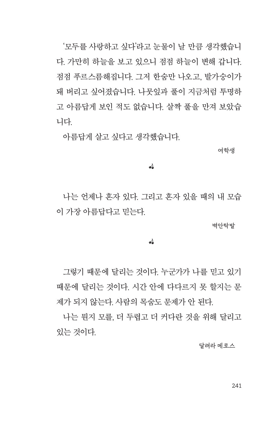 아름다움은 남이 가리켜서 느끼는 것이 아니라, 스스로, 혼자서, 문득 발견하는 것입니다.